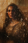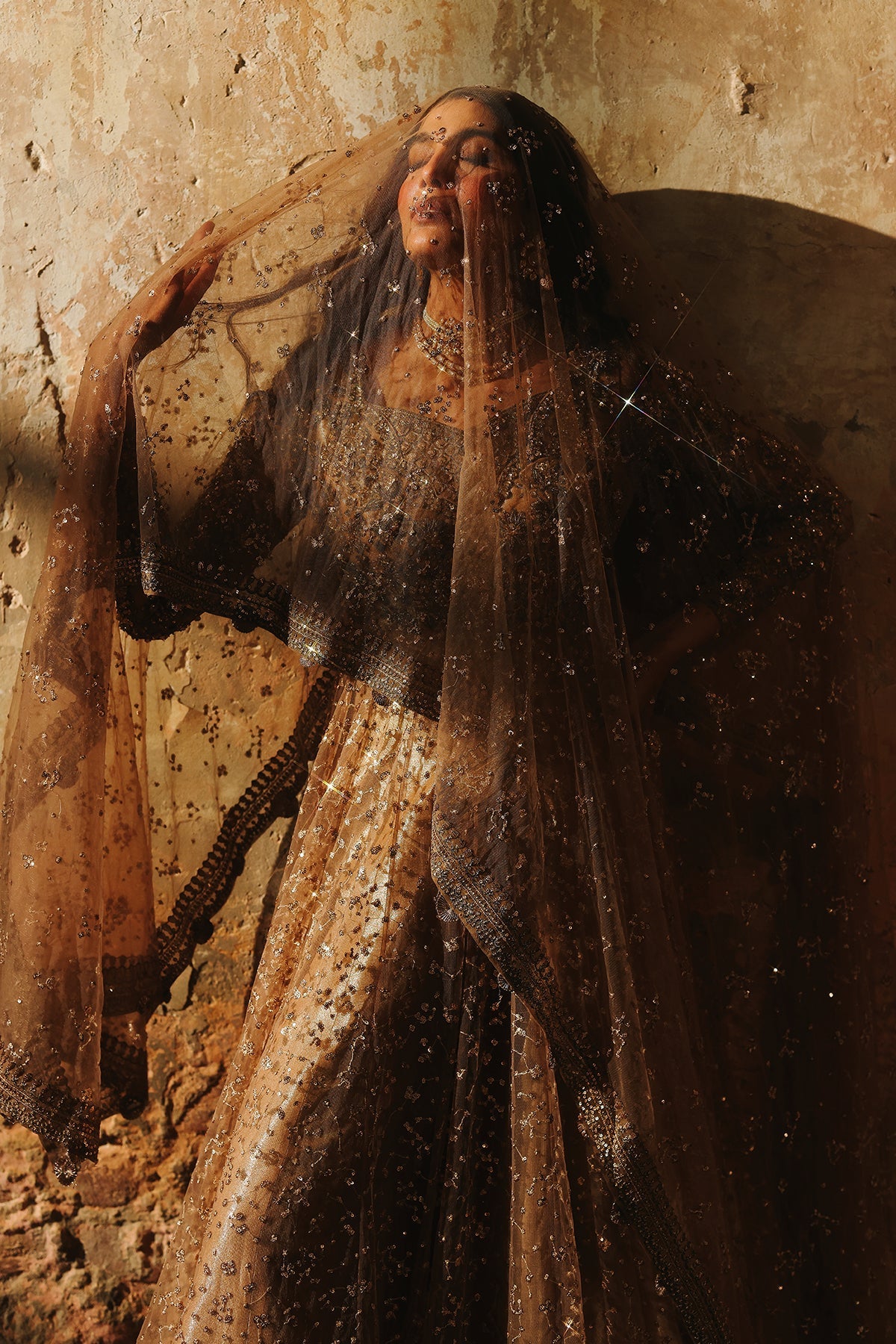 Completed with a subtly adorned net dupatta with dense sequin spray and 4 side sequin borders, this timeless design in muted gold-olive tones is perfect for weddings, festive gatherings, and formal occasions.