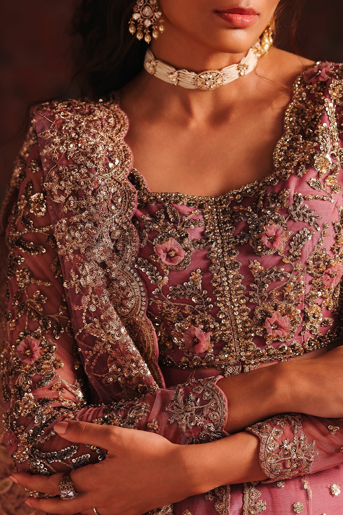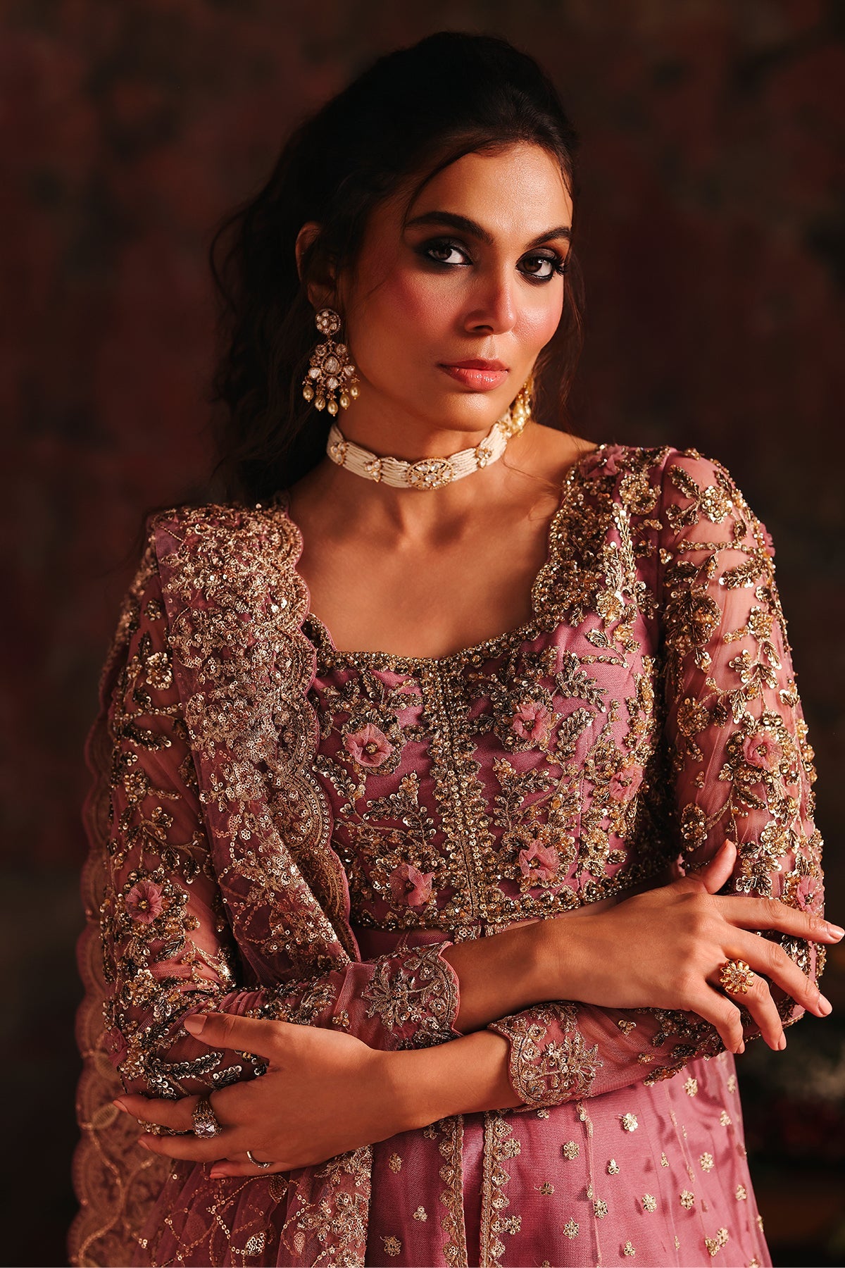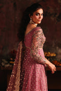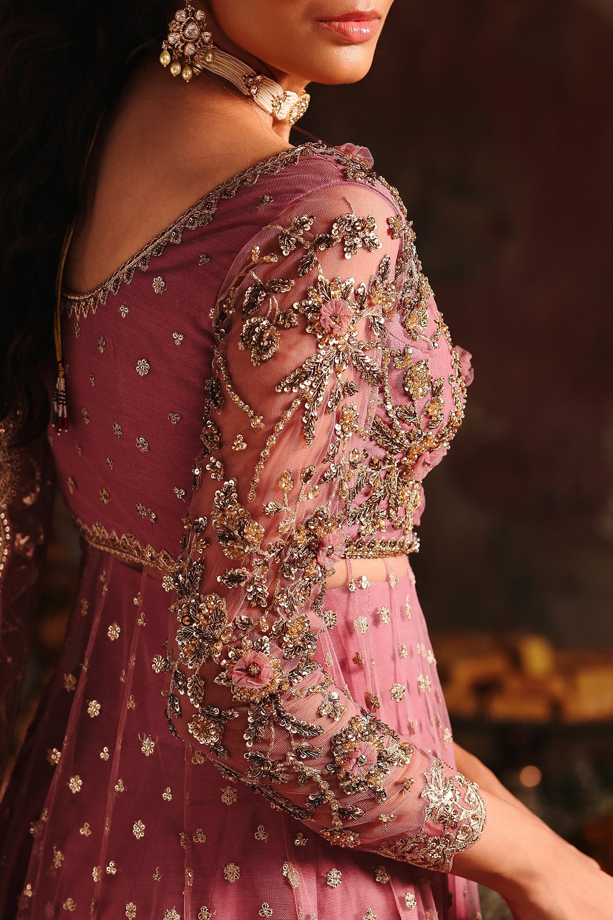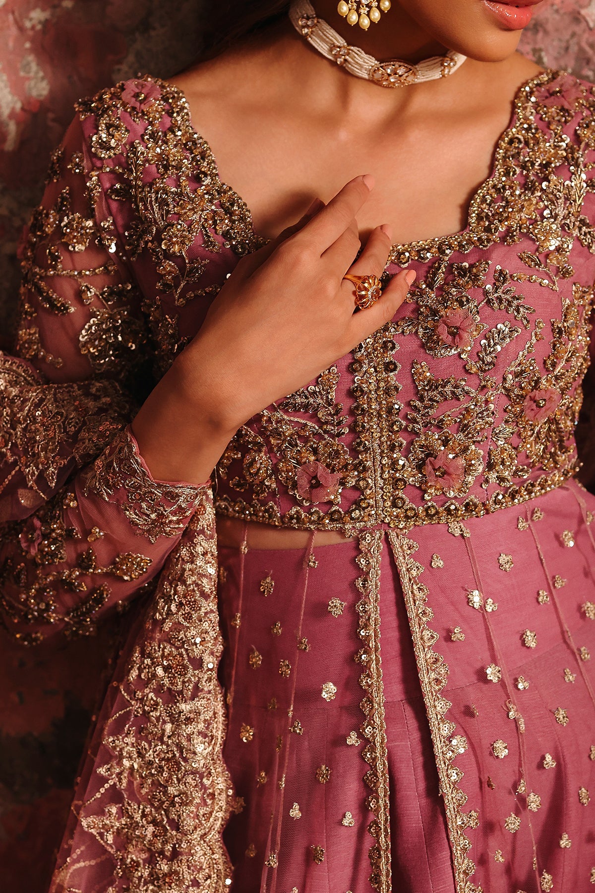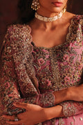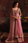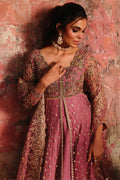 Description: A dusty rose pink ensemble featuring a delicately embellished long pishwas paired with a matching sharara. The pishwas is adorned with intricate gold and antique embroidery, highlighted by a heavily worked bodice, scalloped borders, and fine sequin spray scattered across the flowy silhouette. It is complemented with a sheer net dupatta, finished with sequin embroidered border that adds depth and luxury.