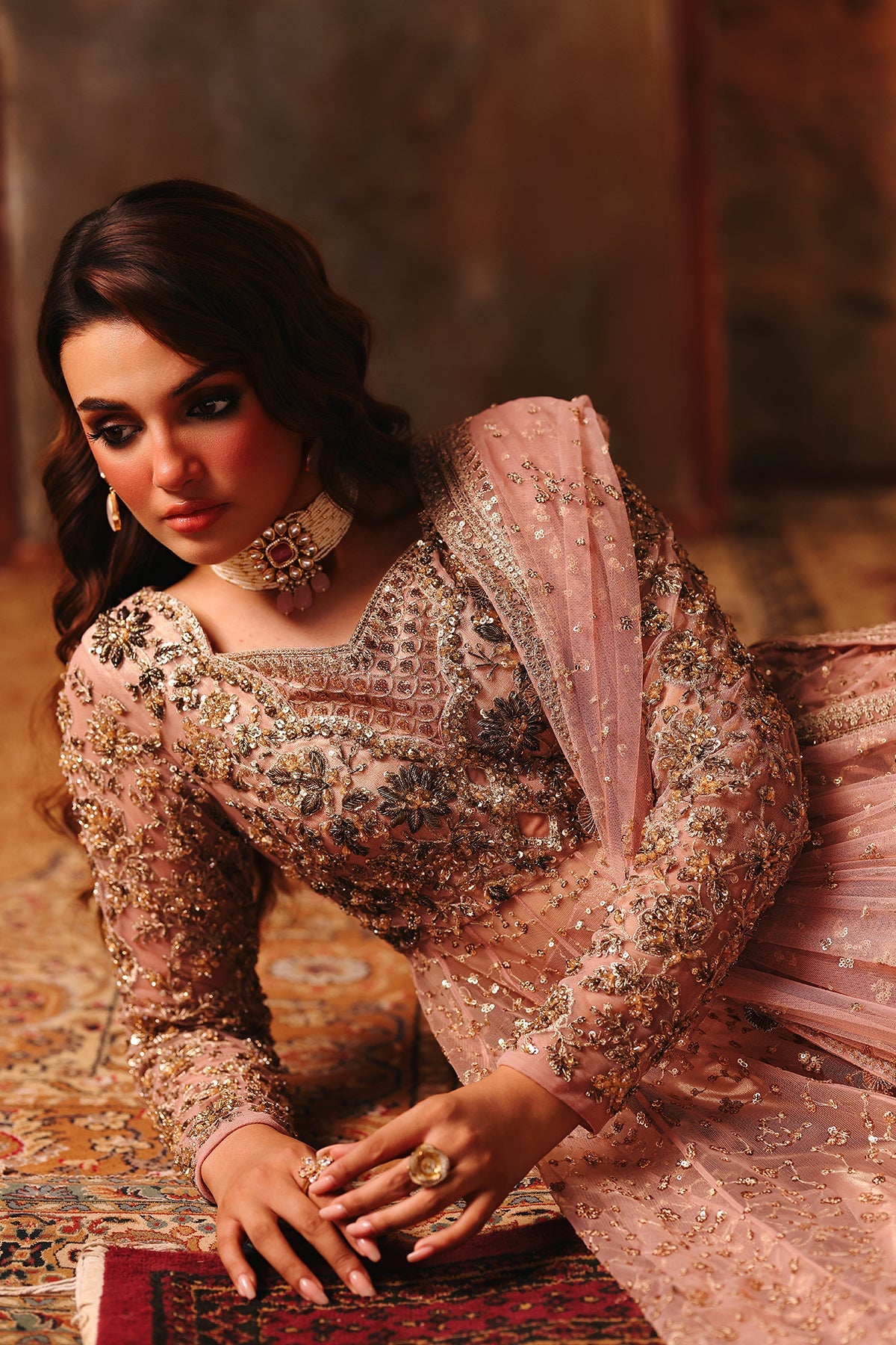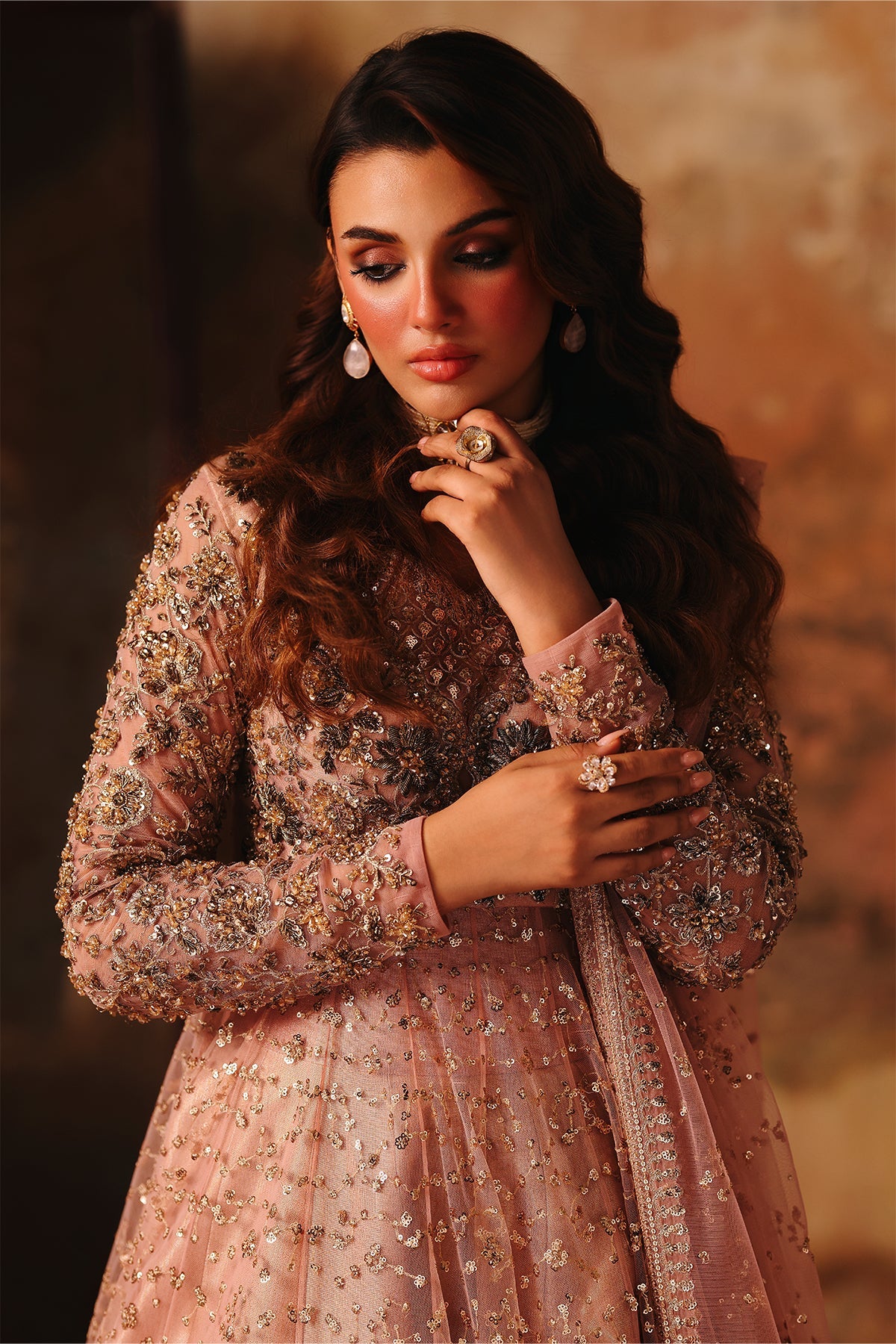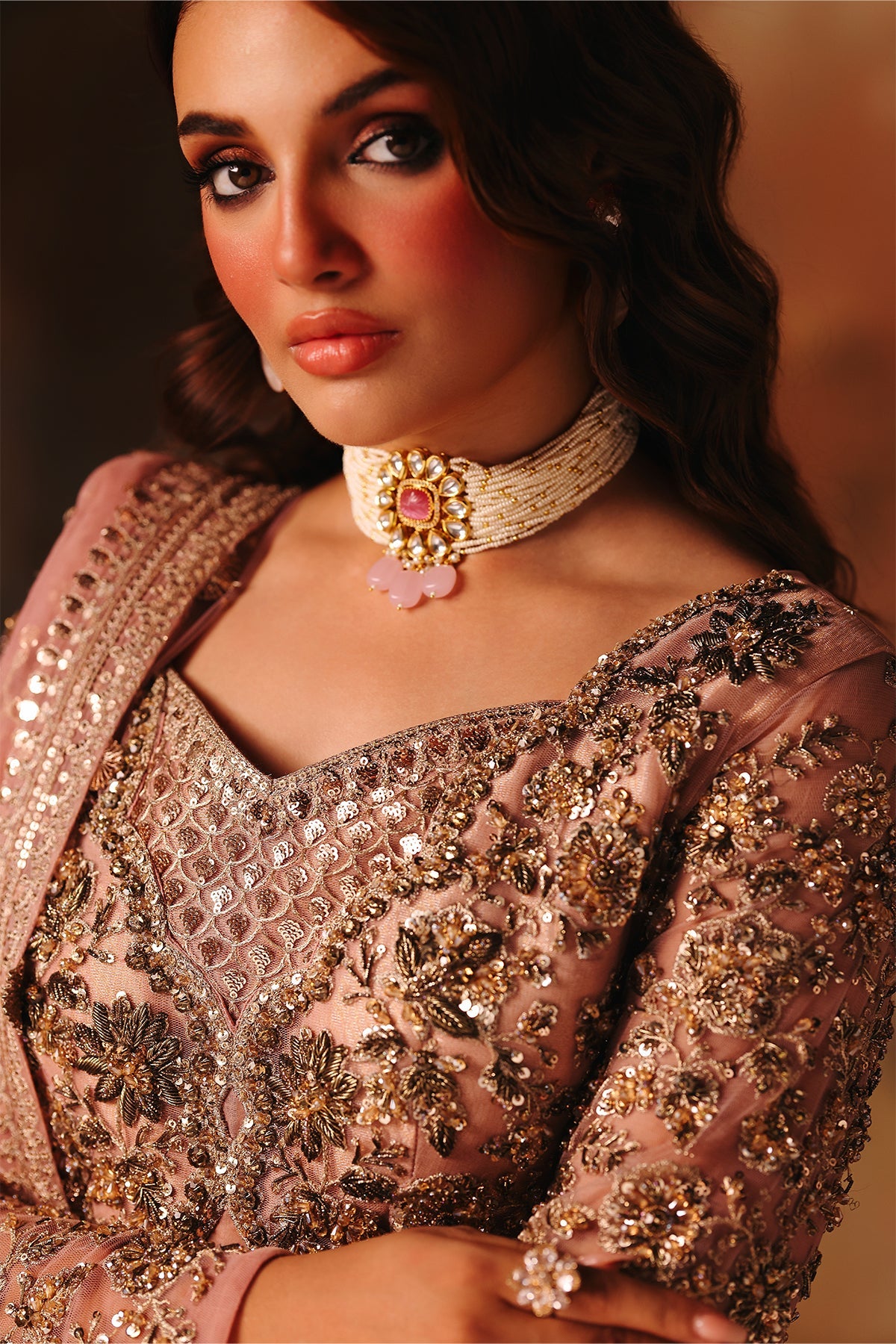 Description: An elegant ensemble featuring a delicately embellished Rose Gold net pishwas, detailed with fine handwork on the bodice and sleeves for a refined, graceful look. The panels are embroidered beautifully with dense sequin work. The pishwas is paired with a flowing tissue sharara, adding a soft sheen and fluid movement to the silhouette.
