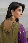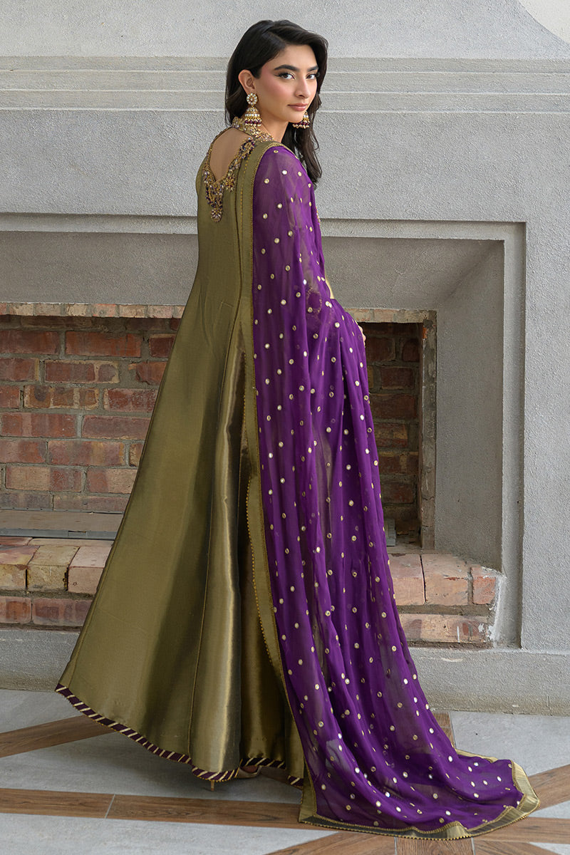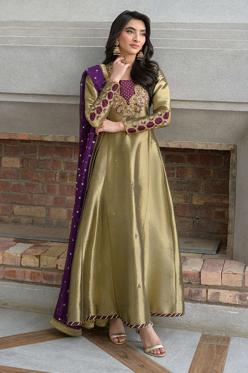 Shine in this exquisite metallic gold-black ensemble, featuring a long kalidar frock paired with straight capri pants and a rich brinjal plum booti chiffon dupatta. Crafted from pure lama silk, the frock is adorned with intricate handwork of stones, gems, zardozi, resham embroidery, and shimmering sequins, creating a luminous and regal appeal. The contrasting plum dupatta adds depth and elegance—perfect for festive occasions.