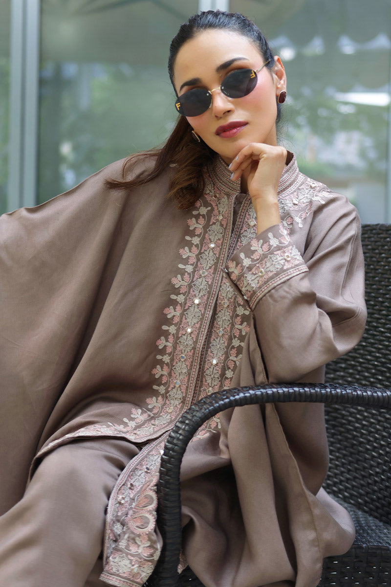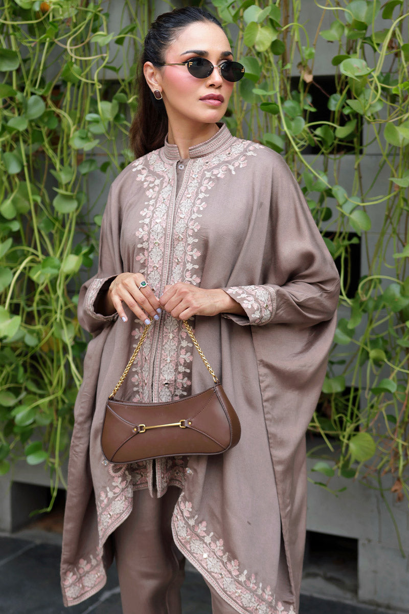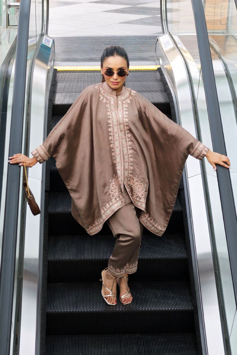 Cinnamon Peach is a sophisticated two-piece set featuring a flowy cape paired with sleek straight pants. Crafted in a rich brown hue with soft peach undertones, the ensemble is beautifully adorned with delicate ari embroidery in ivory and salmon peach, accented with subtle hints of zari for a refined shimmer. Perfect for making an effortless statement.
