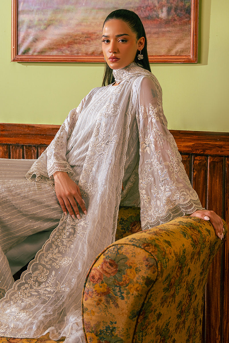 This elegant 4 piece suit features an intricately embroidered chiffon shirt with a 120" patti for the front hem, back hem, and sleeves. The silk dyed trouser is accented with a 60" embroidered patti, while the chiffon dupatta adds a delicate touch. Complete the look with the silk dyed slip. Perfect for a formal occasion.