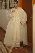 This silk suit includes an embroidered shirt with 1" neckline and embroidered details on the front, back, and sleeves. The front and back hems feature an 80" embroidered patti, while the sleeves have a 40" embroidered patti. The set also includes a silk trouser and slip, as well as an organza embroidered dupatta.
