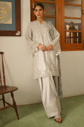 This silk suit features an intricately embroidered shirt with detailed patterns on the front, back, and sleeves. The front hem and sleeves are adorned with 80 embroidered patti, while the back hem has 40 embroidered patti. The trouser is also made of silk and dyed to match the shirt. The ensemble is completed with a chiffon dupatta that is both embroidered and printed.