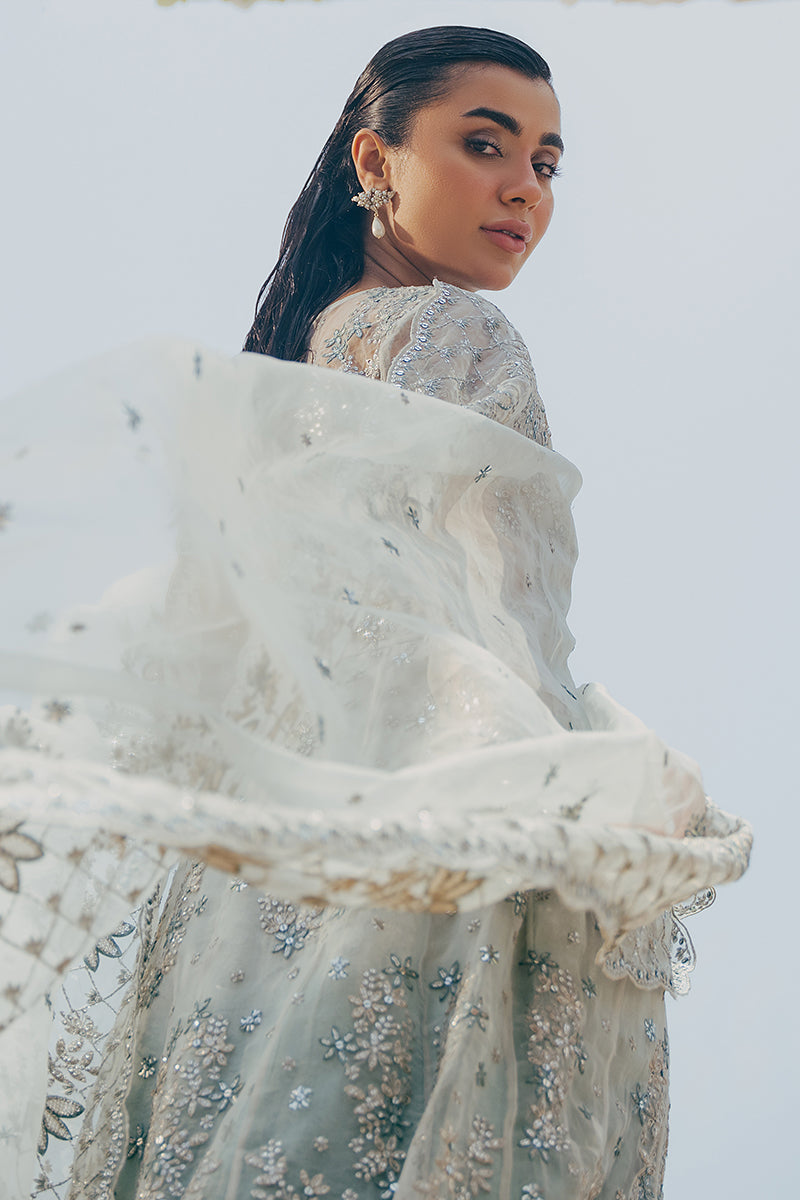 Elevate your style with our luxurious SAFFRON CHARM-2 PC ORGANZA EMBROIDERED PRET. The front and back of the pishwas are intricately embroidered, while the neckline and sleeves are adorned with betki and flower embellishments. The poly organza dupatta adds a touch of elegance to the overall look. Perfect for special occasions.
