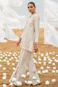 Enhance your style game with our SCINTILLATING CRYSTAL-2PC SILK EMBROIDERED PRET set. The silk jacket features a unique front opening with sheer border and tasseling detail, while the back is dyed and embroidered with a see-through hem. The V-neckline and straight sleeves add elegance with embroidered patch and tasseling details. The long culottes silk trouser completes the luxurious look with its embroidered design and fusing with lining. Elevate your wardrobe with this elegant and sophisticated ensemble.