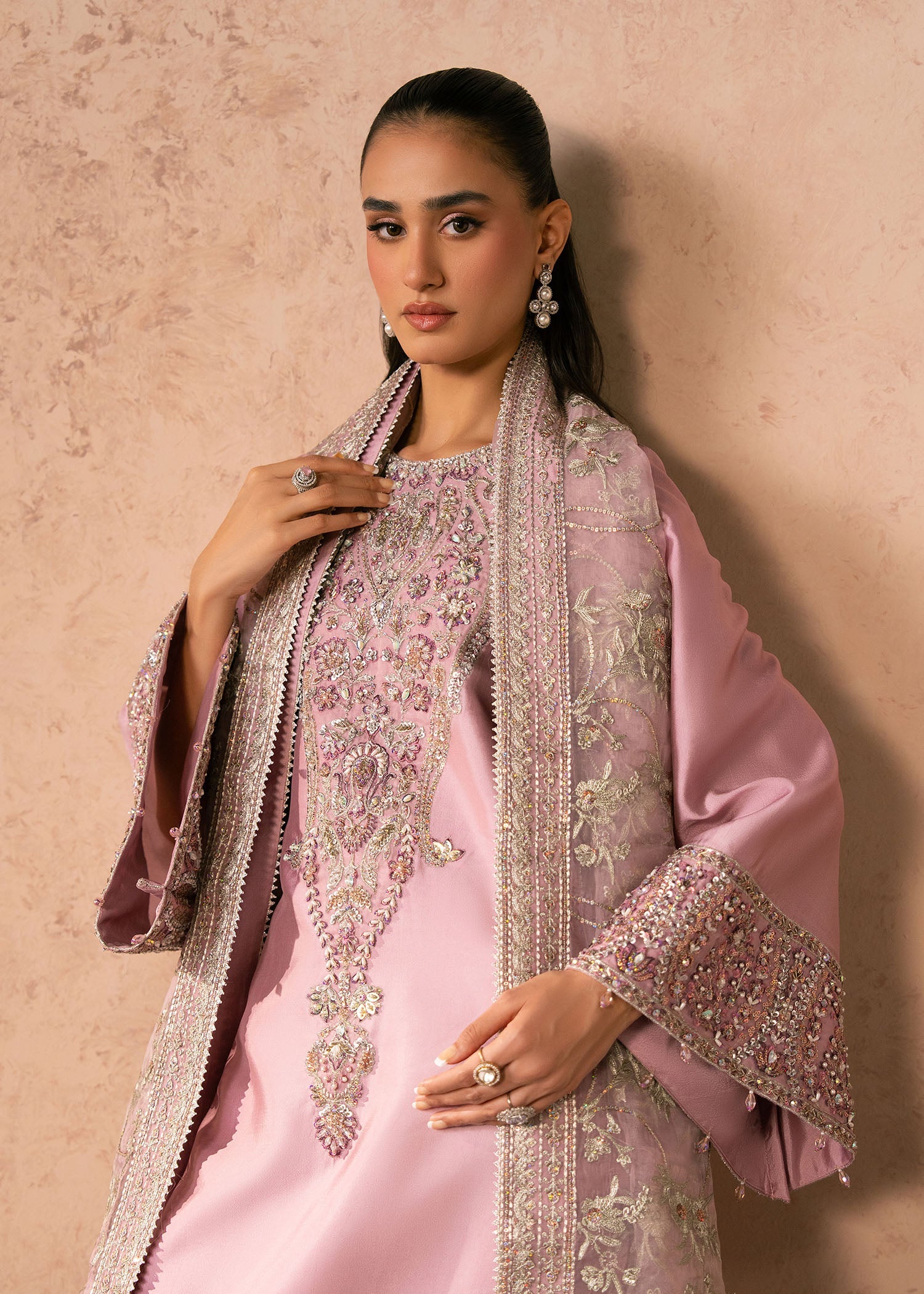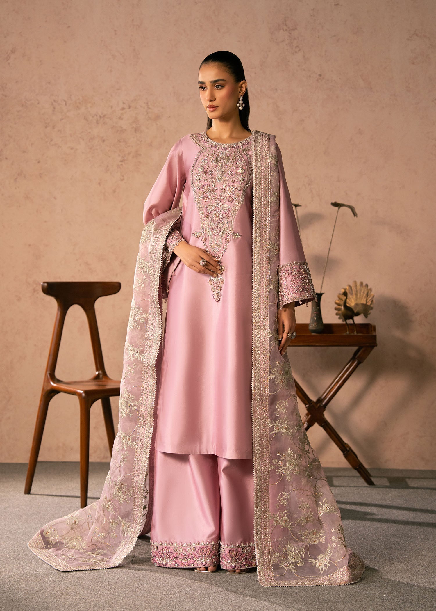 The ensemble is completed with a sheer organza dupatta, beautifully decorated with floral threadwork and a finely detailed border. Draped elegantly over one shoulder and flowing onto the floor, it adds softness, movement, and a luxurious feel to the overall look.