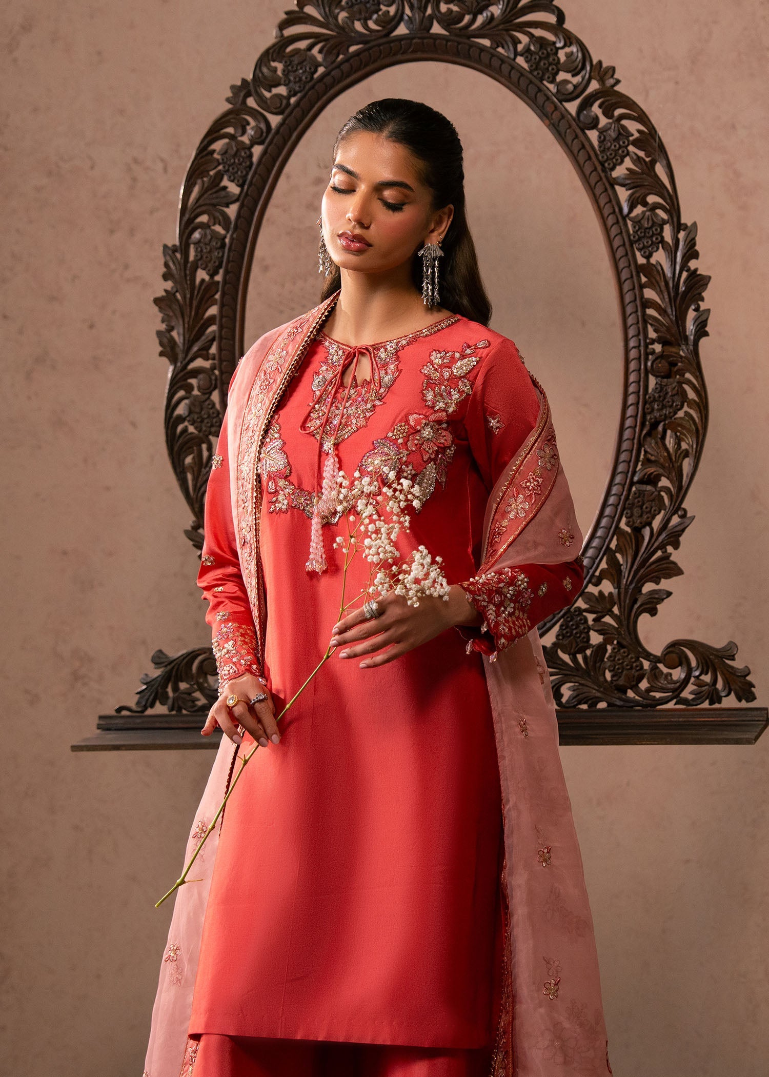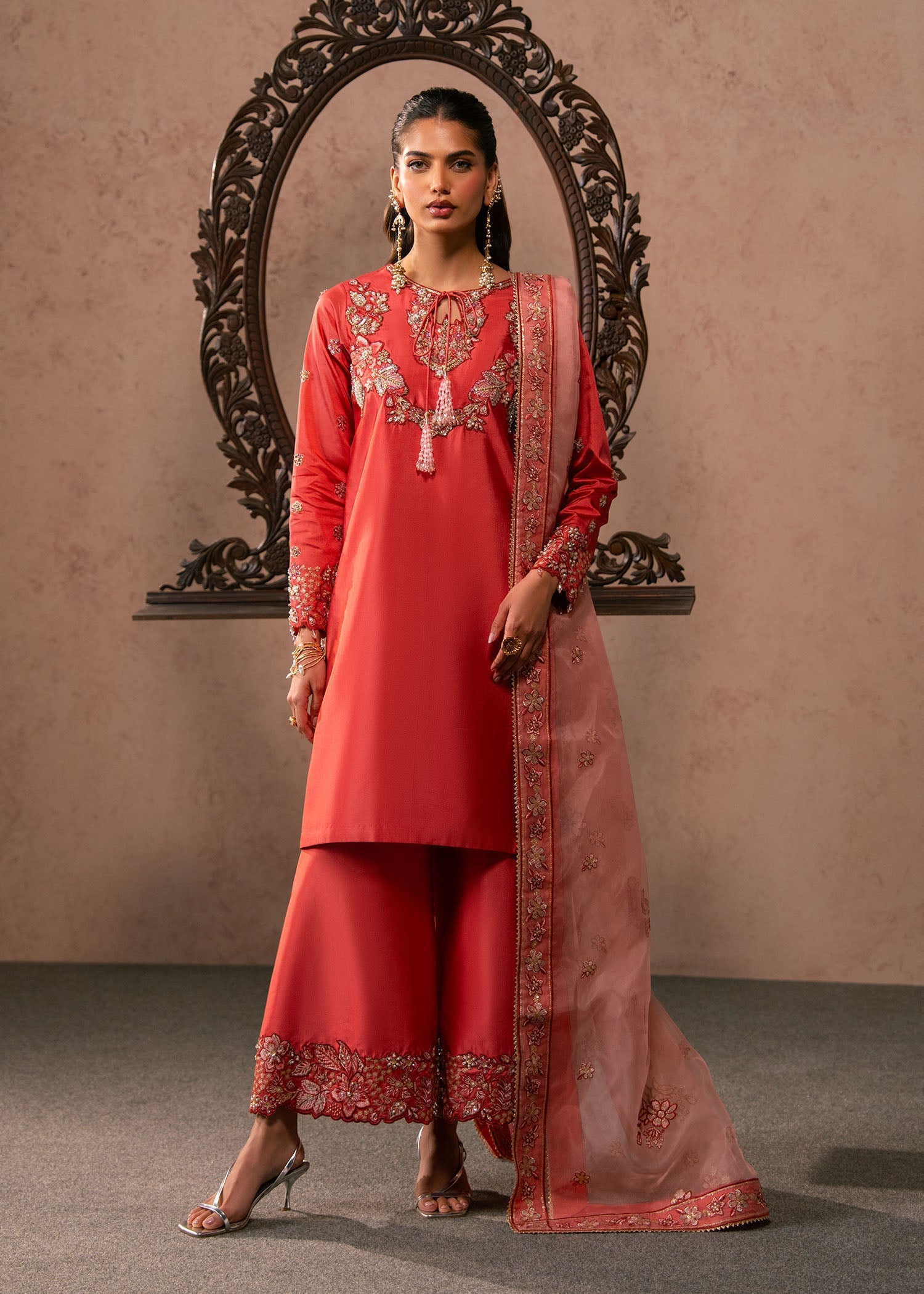 A sheer organza dupatta completes the ensemble, featuring a finely embroidered border and scattered motifs throughout. Draped gracefully over one shoulder, it adds lightness and sophistication to the overall look.