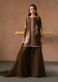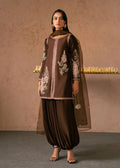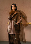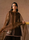 A sheer organza dupatta in matching brown completes the ensemble, lightly embellished and draped effortlessly over the shoulders for an ethereal touch.