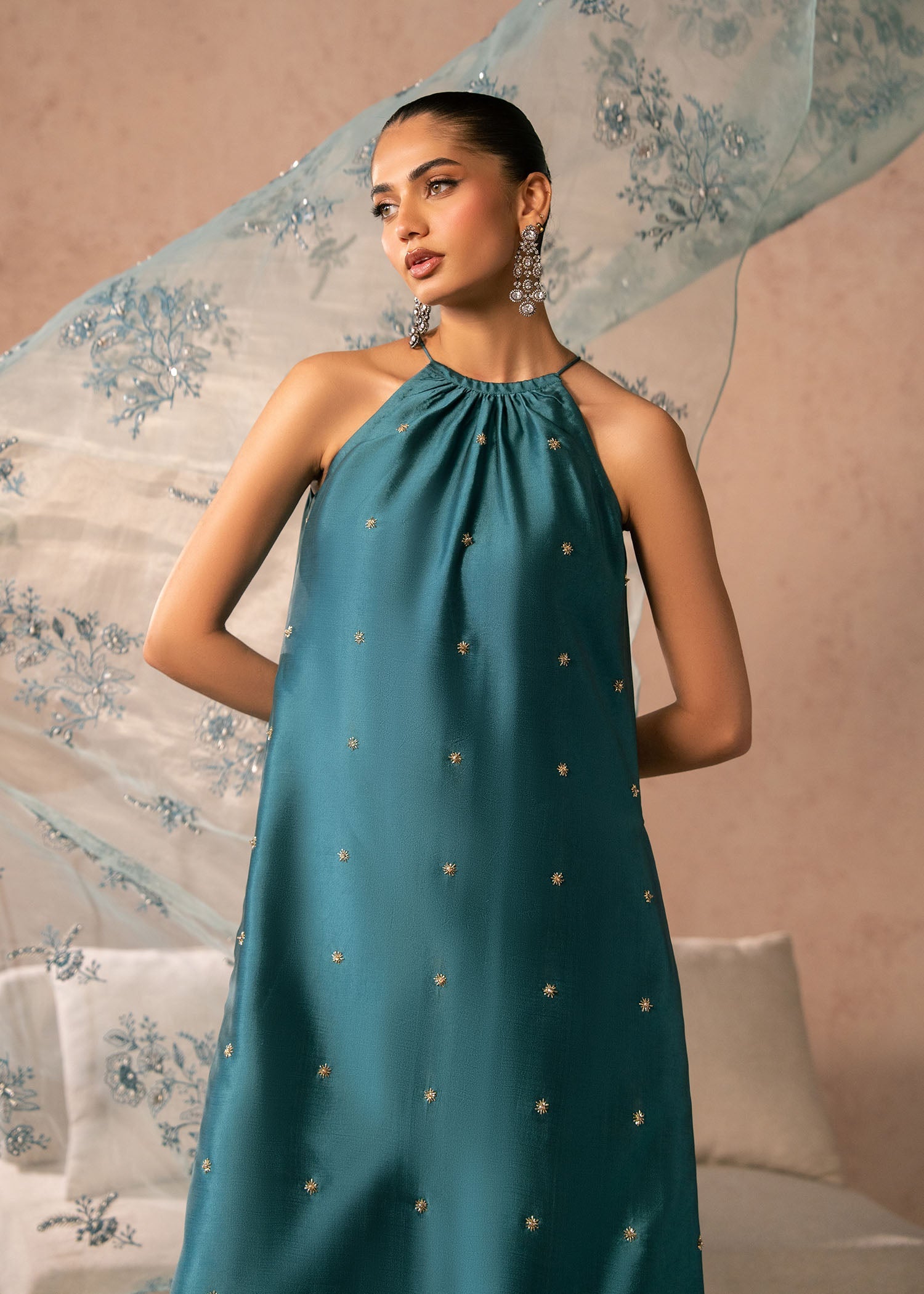 The look features a sleeveless, halter-neck kurta with a soft gathered neckline that creates a fluid, elegant drape. The silhouette is straight and relaxed, offering effortless sophistication. Subtle gold embellishments are scattered delicately across the fabric, adding understated sparkle without overpowering the design.