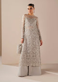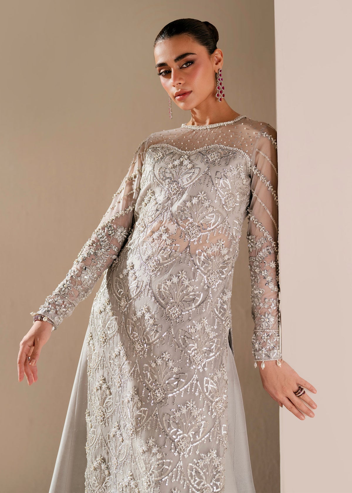 Orchid is a refined grey ensemble that speaks in soft shimmer and intricate detail. The long shirt features a sheer organza inset, delicately hand-embellished with Swarovski stones and fine crystals, creating a subtle, radiant glow. Tonal threadwork and micro-sequins trace elegant patterns across the fabric, adding depth without excess. Paired with fluid pure silk sharara pants, the look balances modern grace with artisanal luxury effortlessly polished, endlessly poised.