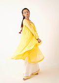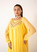Behold 'Flora', a bright and beautiful yellow chiffon dress with a stunning plate-style design, adorned with mirror work and intricate embroidery. Paired with loose-cut raw silk trousers, this ensemble is a perfect blend of elegance and sophistication, ideal for making a statement.