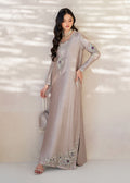 In the serene nights of Eid, Eris, shines with understated elegance. This grey ensemble combines tissue silk fabrics with intricate hand embroidery and sequin work, complemented by an Organza dupatta. Ideal for those who crave timeless sophistication during the festive season.