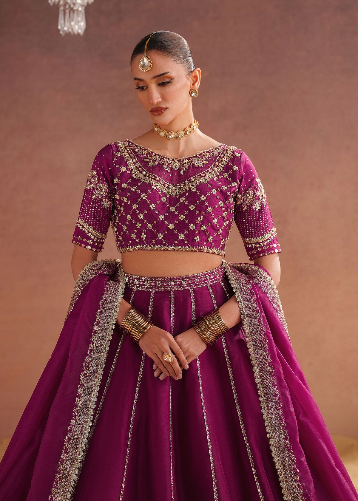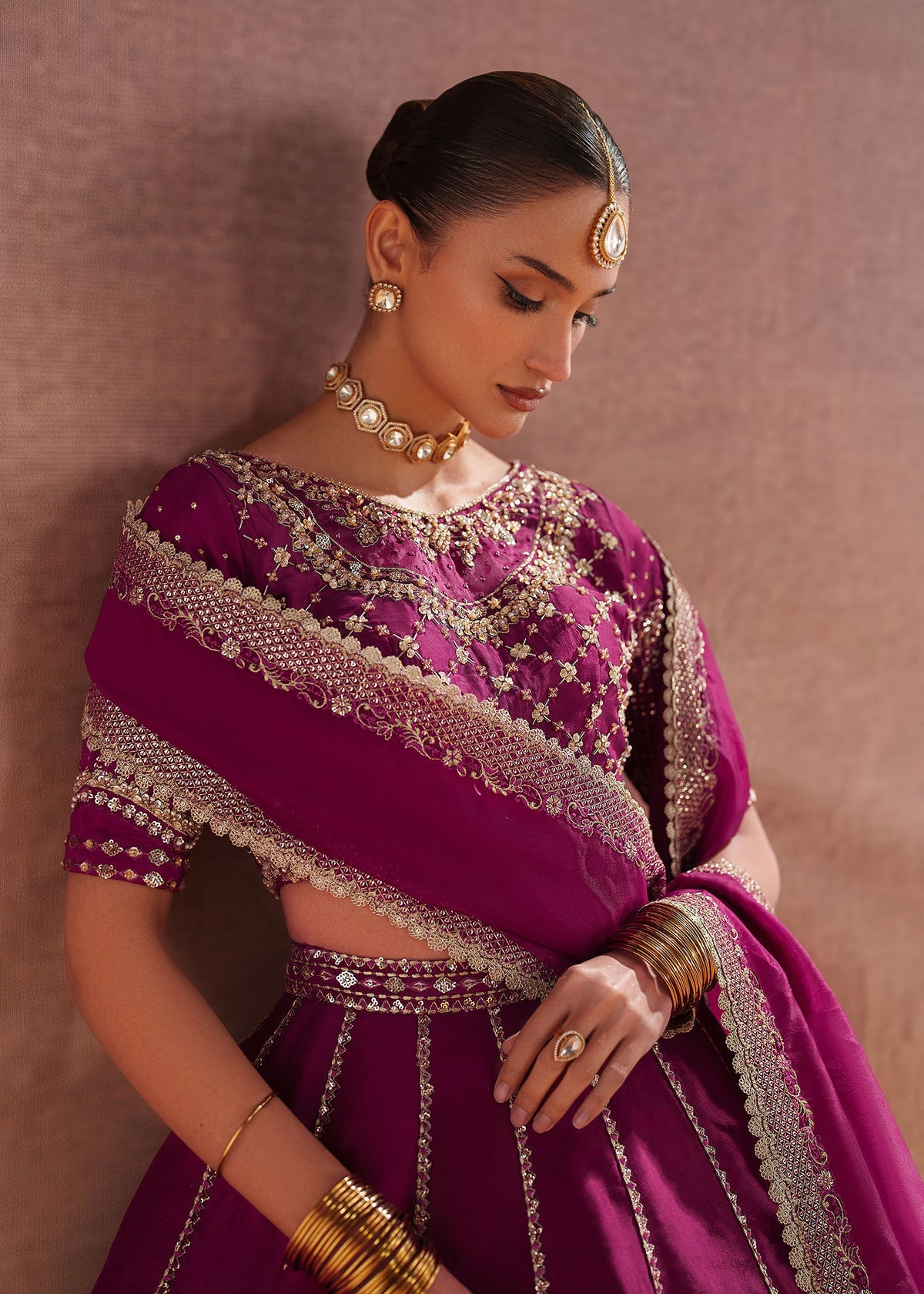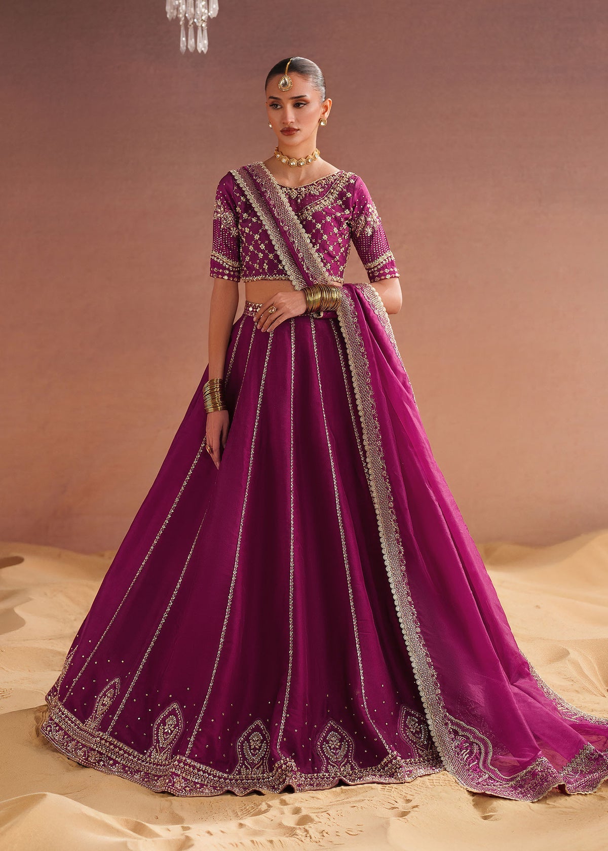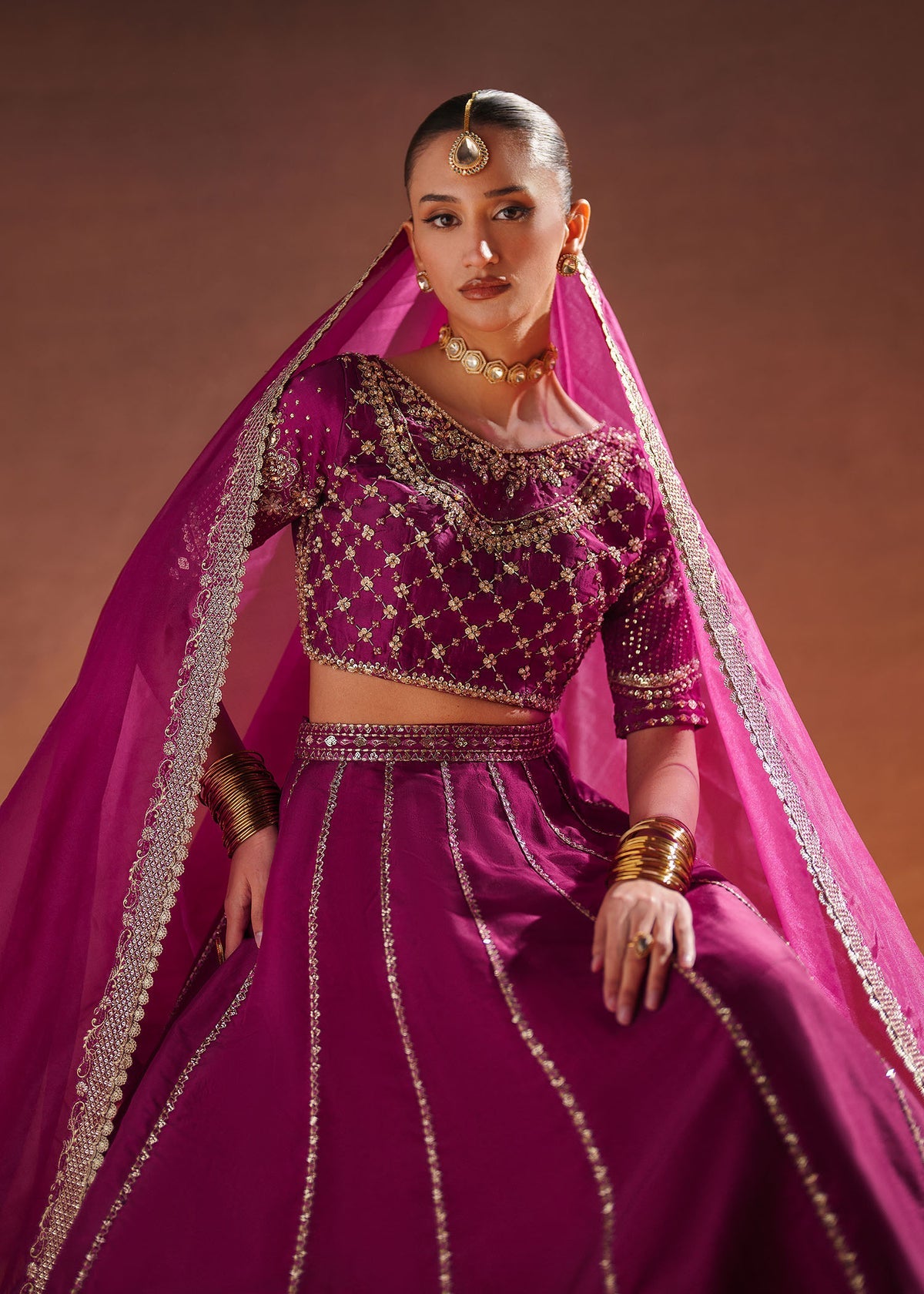 This Burgundy outfit features a Blouse and Lehnga set in Tissue silk fabric, adorned with intricate embroidery and sequin , beads, saroski, crystals, pearls paired with an Organza Embroidered dupatta. Perfect for those who love understated luxury and elegance!
