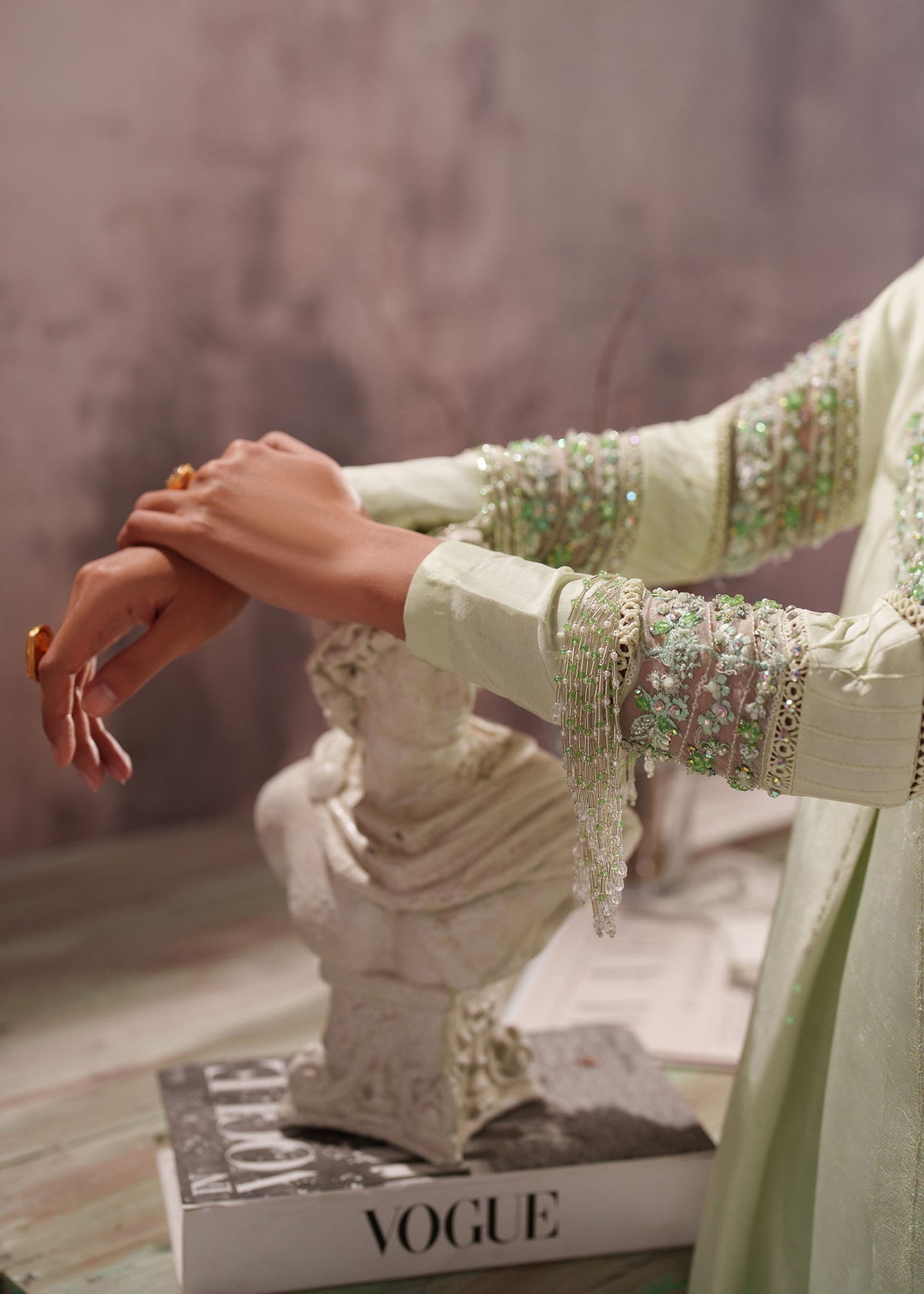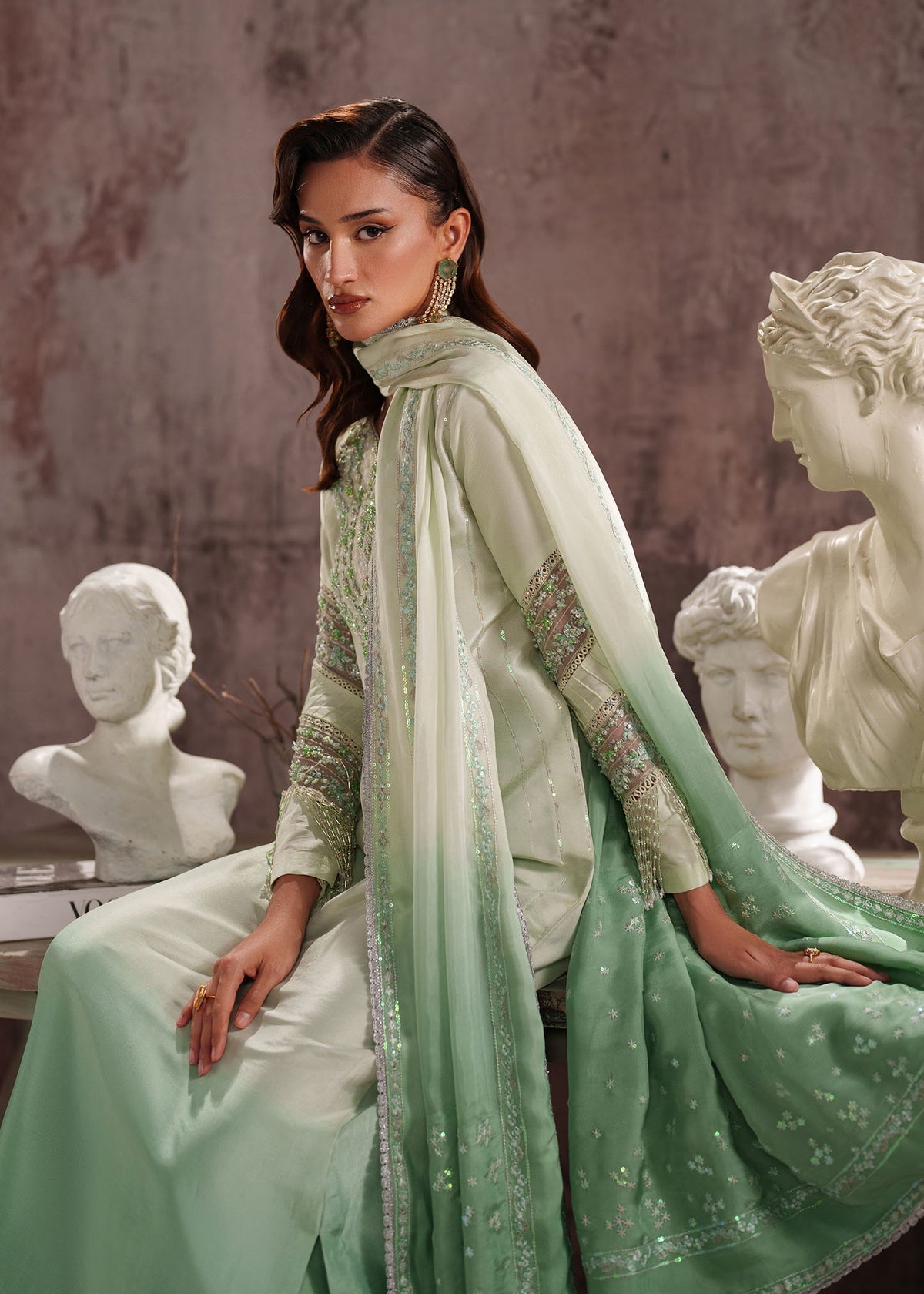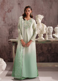 A captivating play of color, this ombre outfit transitions seamlessly across dual shades on tissue silk, with matching Sharara pants for a harmonious look. The sheer Silk dupatta adds fluidity and movement, embodying modern festivity with a classic touch.