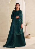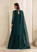 Bold and regal, this bottle green creation is rendered in lustrous tissue silk. The tailored shirt with fully Embellished hanging Tussal and Sharara pants are paired with a Cutwork organza dupatta, making it a striking choice for evening celebrations and festive gatherings.
