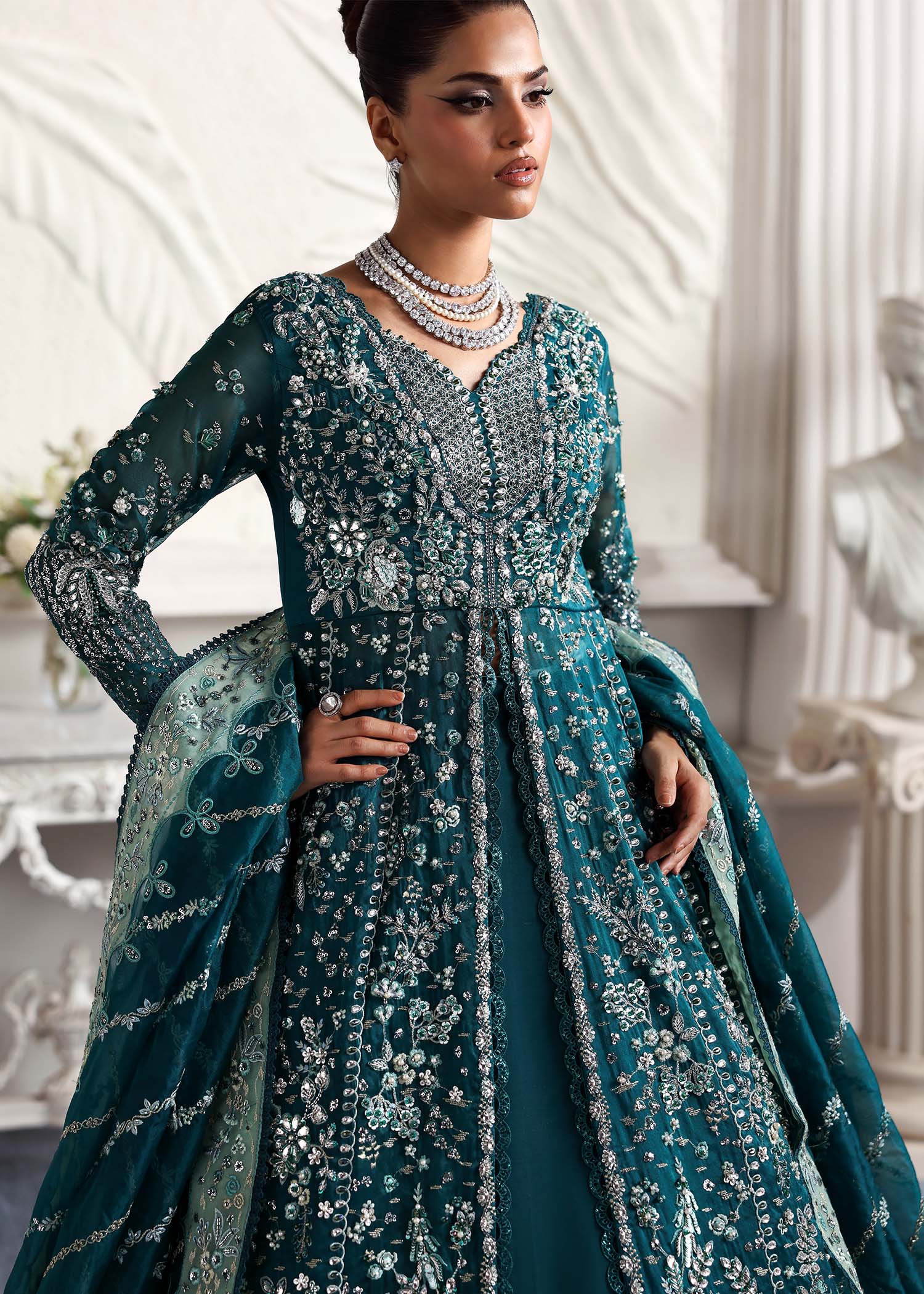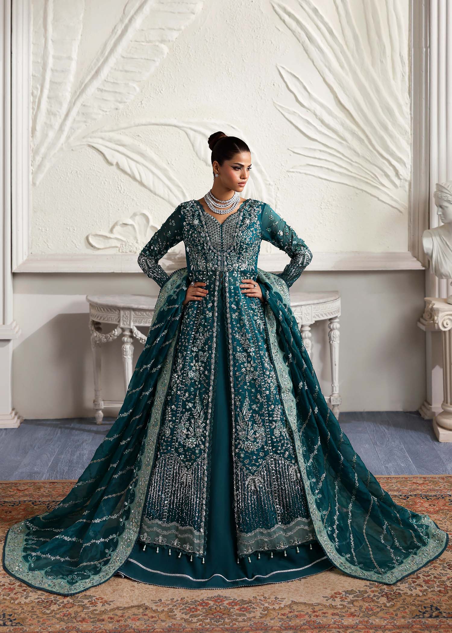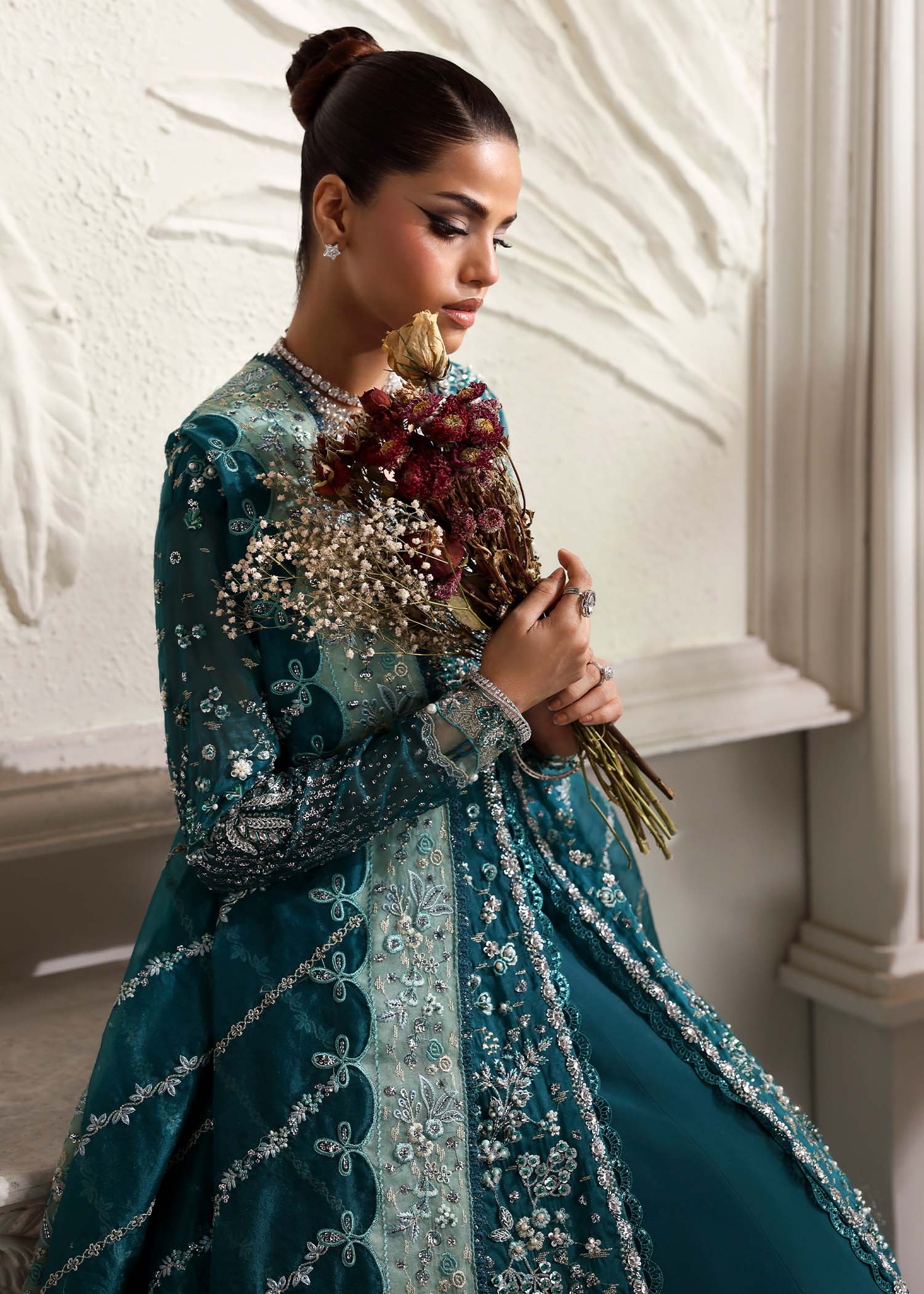 Éclat is that rare ensemble that doesn’t just dress you, it becomes a feeling, a fleeting moment turned timeless. Cloaked in a mesmerizing shade of deep teal, this modern pishwas reimagines tradition with a fluid front-open silhouette and soft, sweeping flair that moves like poetry. Intricate floral motifs bloom in serene blue across the fabric, brought to life with delicate hand-finished embellishments that glisten gently with each step. The look is completed with a silver-dusted dupatta that adds just the right touch of ethereal shimmer. Éclat is equal parts elegance and ease — graceful, feminine, and striking in its simplicity. Made for moonlit wedding nights and memories you’ll return to forever, this piece is a quiet showstopper — luxurious, rare, and impossible to forget.