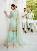 Step into bridal bliss with our Janna Ensemble from Shehnai Bridals Collection”24. This captivating powder blue ensemble showcases a meticulously crafted shirt with intricate embroidery, a majestic four-sided embroidered organza dupatta, and a flowing organza garara, all woven together with a touch of magic.