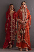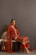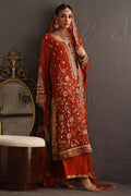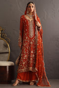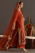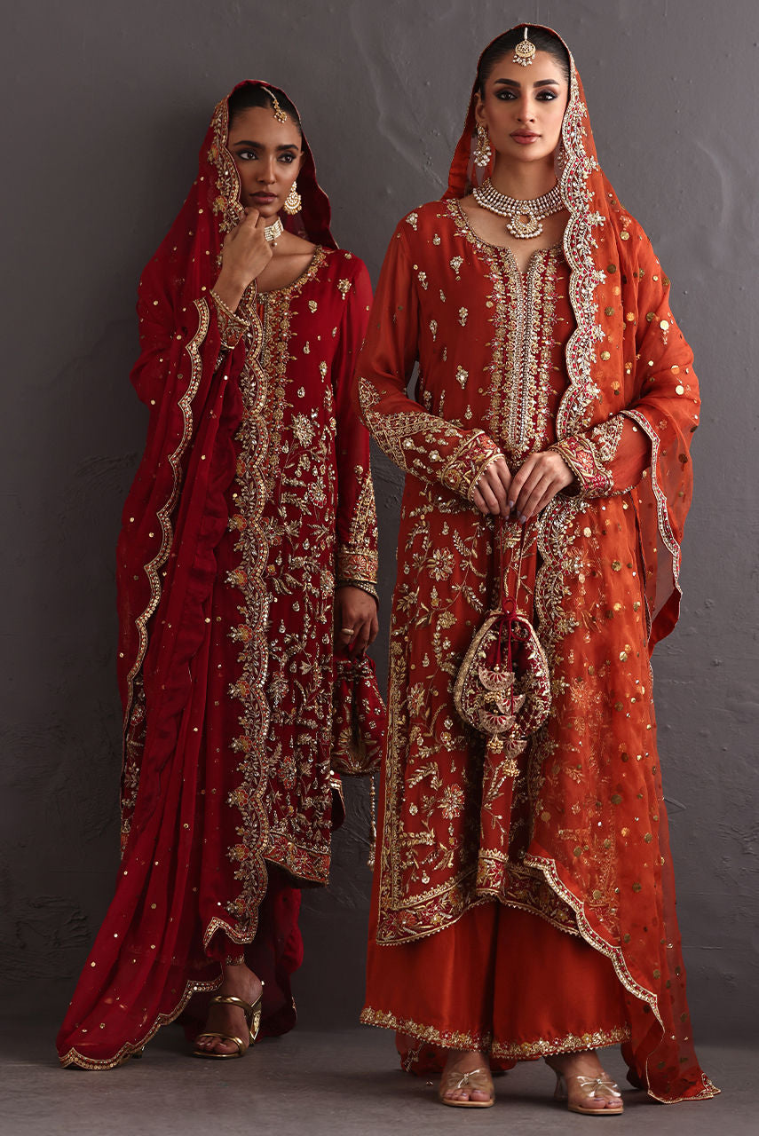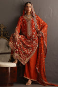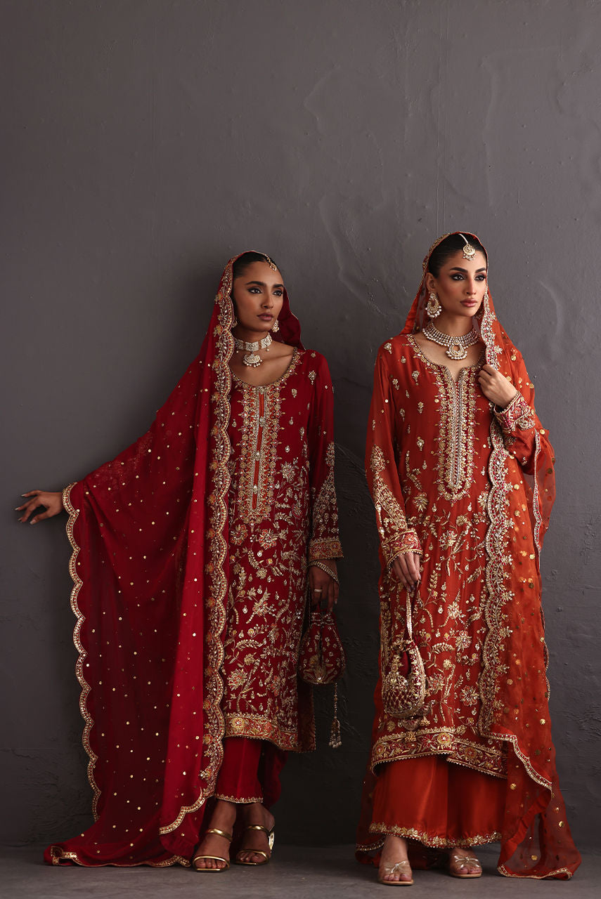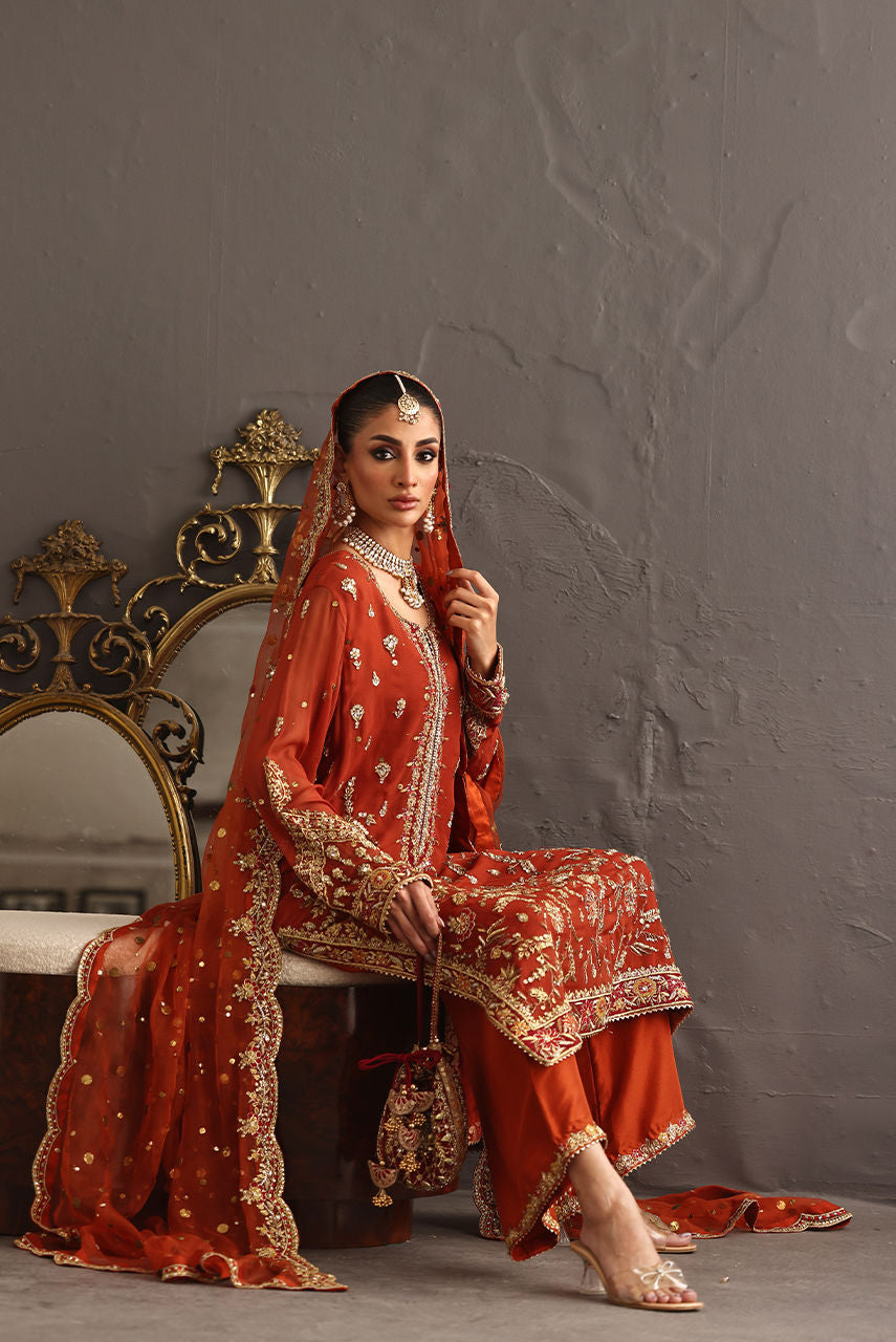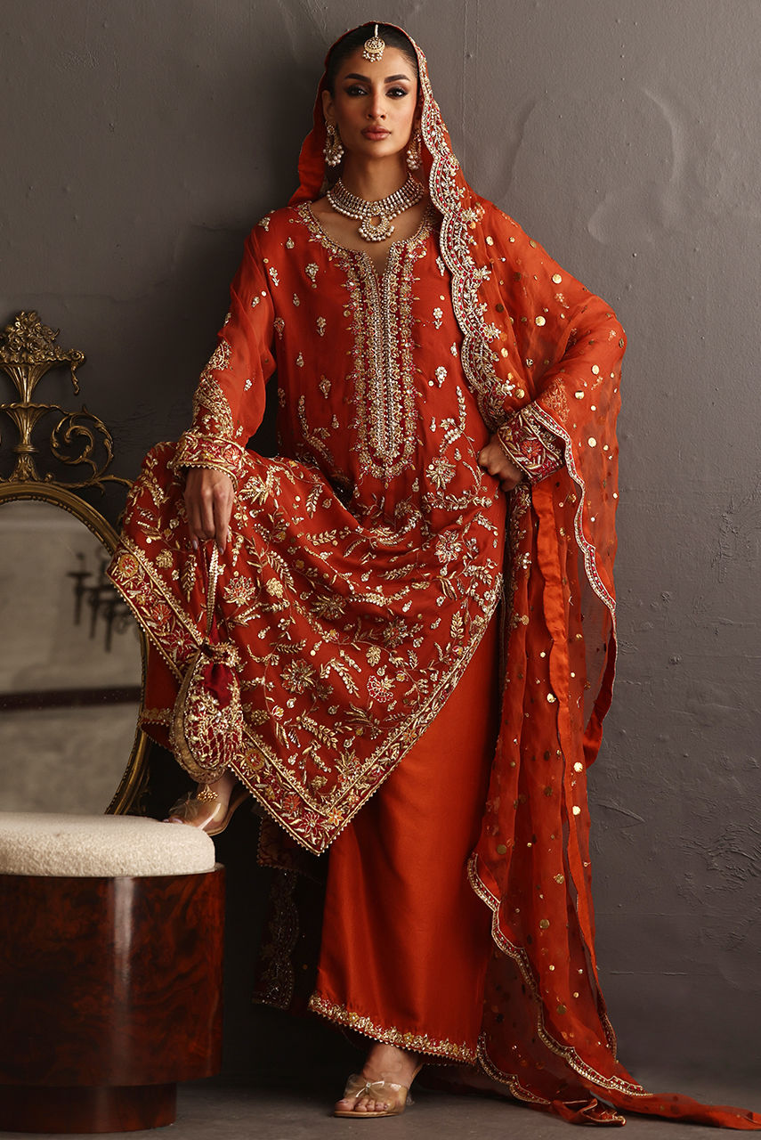 This piece celebrates the poetry of opulence and heritage, rendered in a deep burnt orange base that symbolizes festivity and grace. The surface is richly hand-embroidered with zardozi, resham, crystals and kamdani, creating a tapestry of intricate floral vines and ornamental borders reminiscent of mughal jewelry craftsmanship. The shirt is crafted from kamdani chiffon and the Dupatta in kamdani organza the outfit comes with a pure raw silk Izaar hand worked in zardozi.