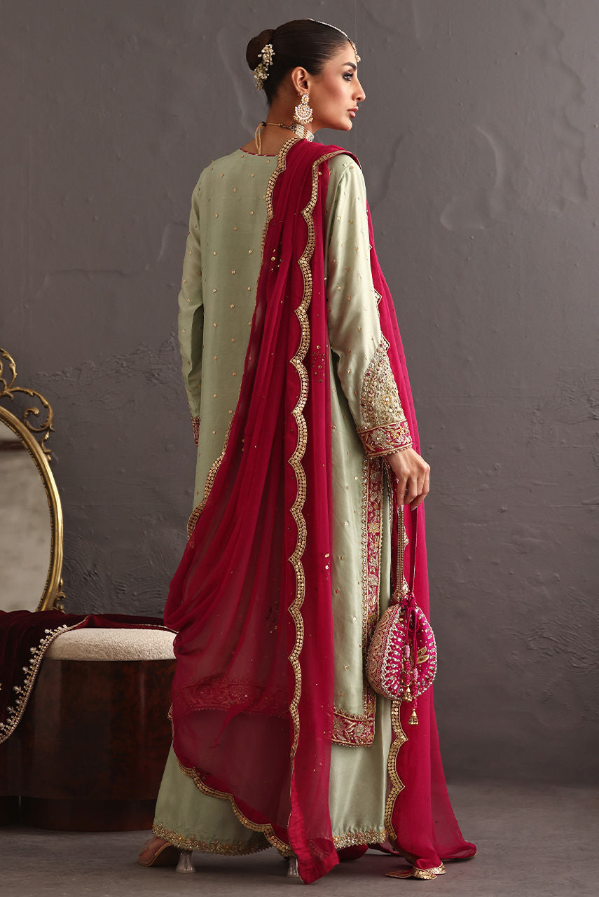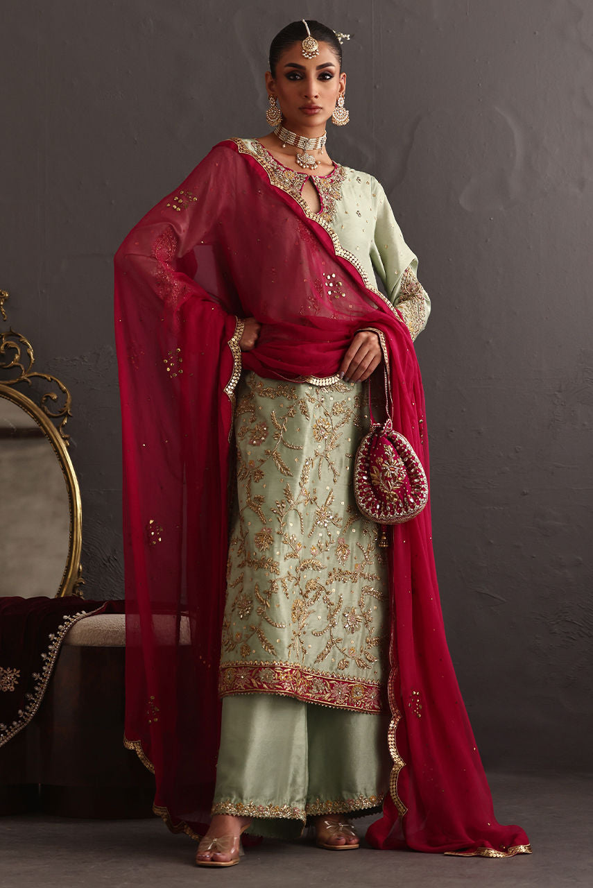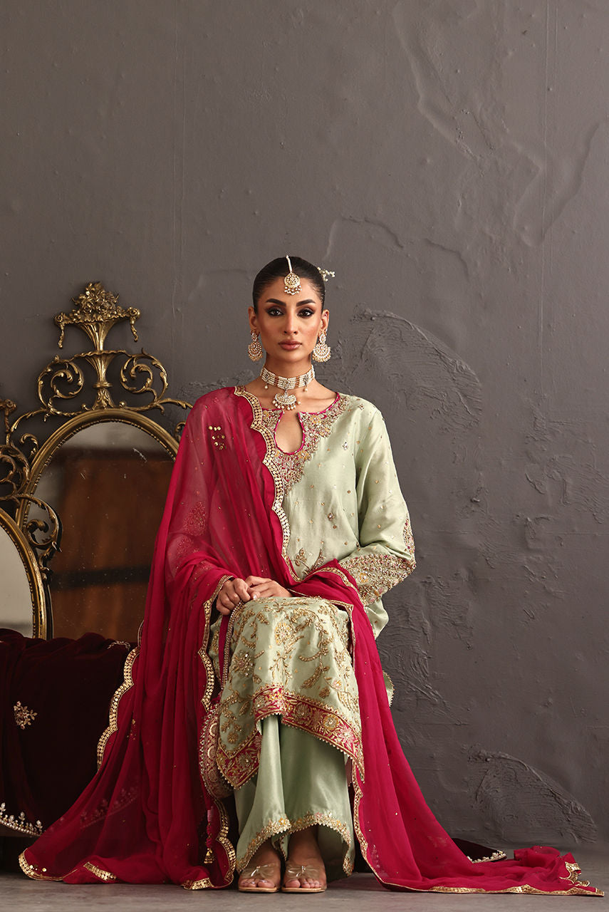 This piece celebrates the poetry of opulence and heritage, rendered in a misty jade symbolizes festivity and grace. The surface is richly hand-embroidered with zardozi, resham, crystals and kamdani, creating a tapestry of intricate floral vines and ornamental borders reminiscent of mughal jewelry craftsmanship. The shirt and dupatta are crafted from kamdani chiffon and the outfit comes with a pure raw silk izaar with zardozi.