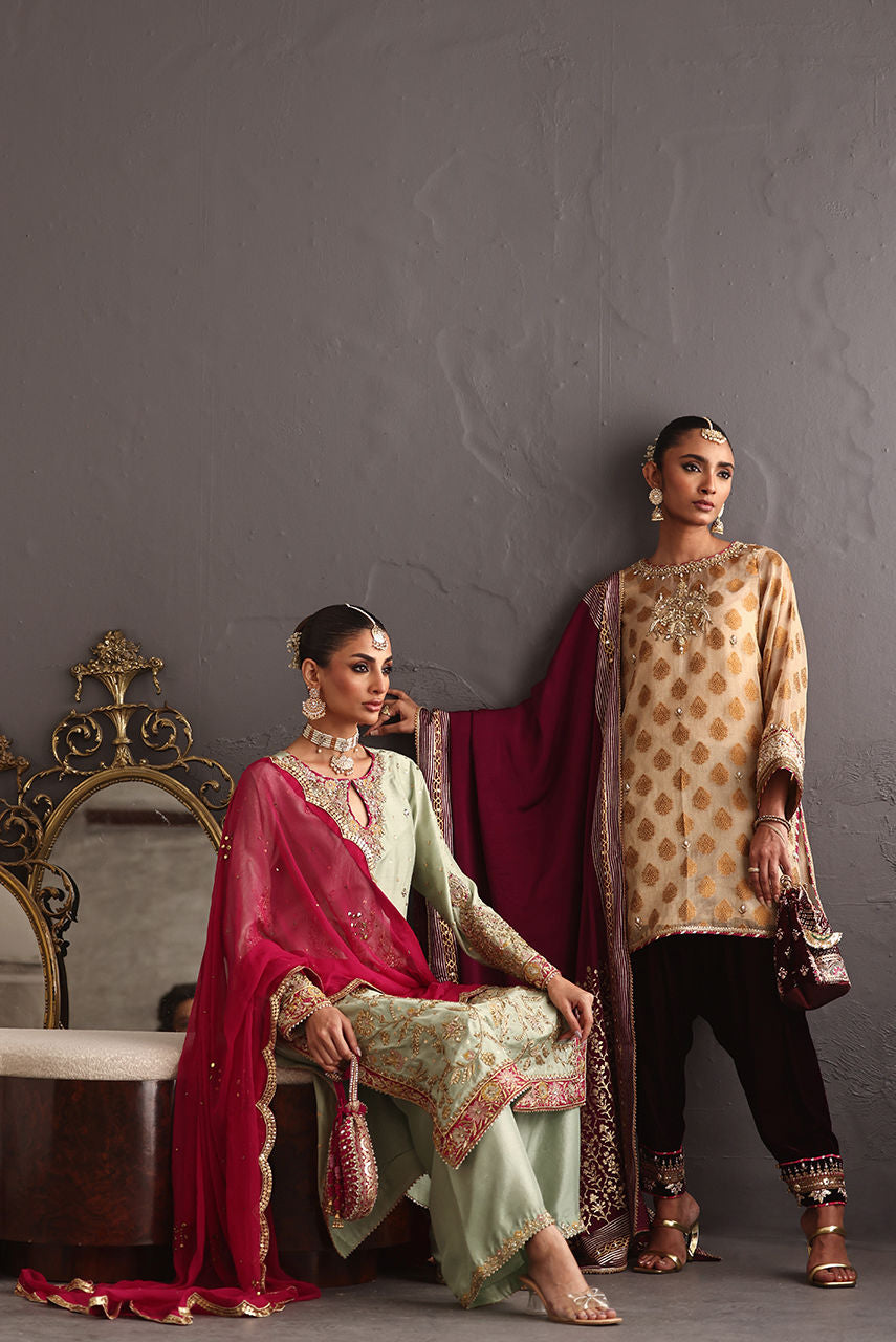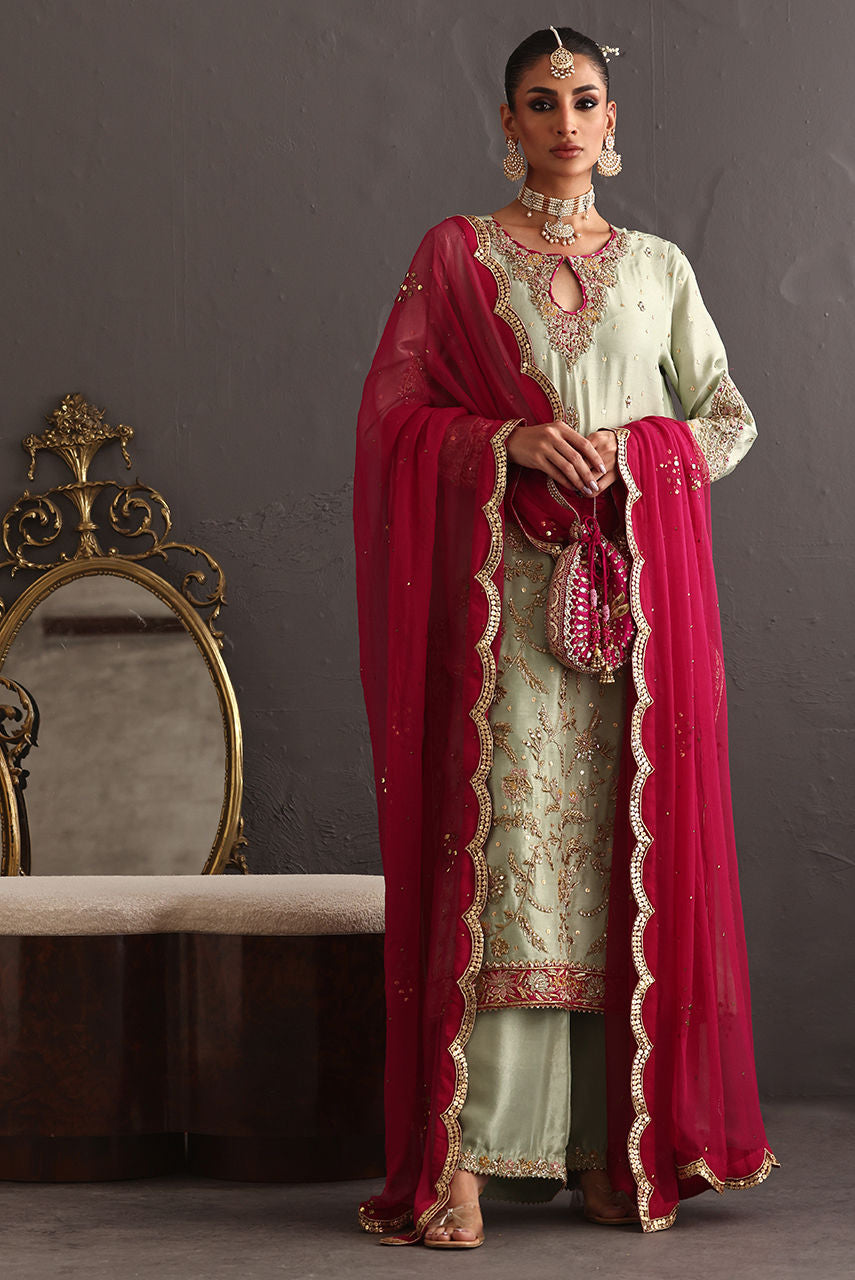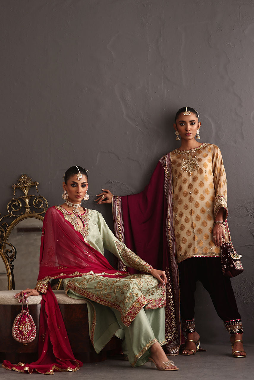 This piece celebrates the poetry of opulence and heritage, rendered in a misty jade symbolizes festivity and grace. The surface is richly hand-embroidered with zardozi, resham, crystals and kamdani, creating a tapestry of intricate floral vines and ornamental borders reminiscent of mughal jewelry craftsmanship. The shirt and dupatta are crafted from kamdani chiffon and the outfit comes with a pure raw silk izaar with zardozi.