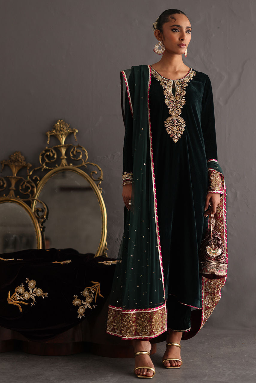 A forest green velvet ensemble with magenta accents, featuring exquisite zardozi work on the neckline and trousers. Styled with a French net dupatta adorned with a block printed handworked border and delicate sequin detailing for a refined, festive finish.