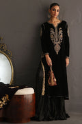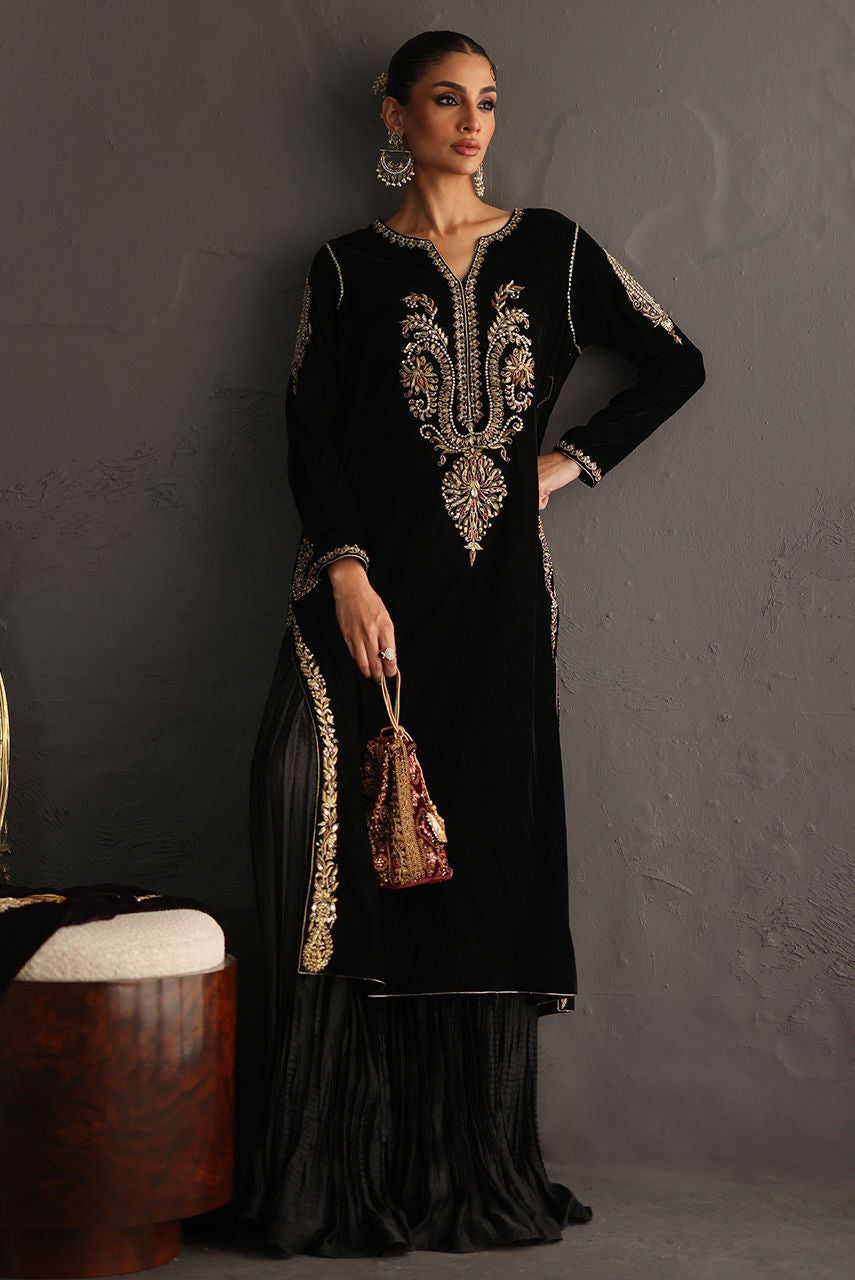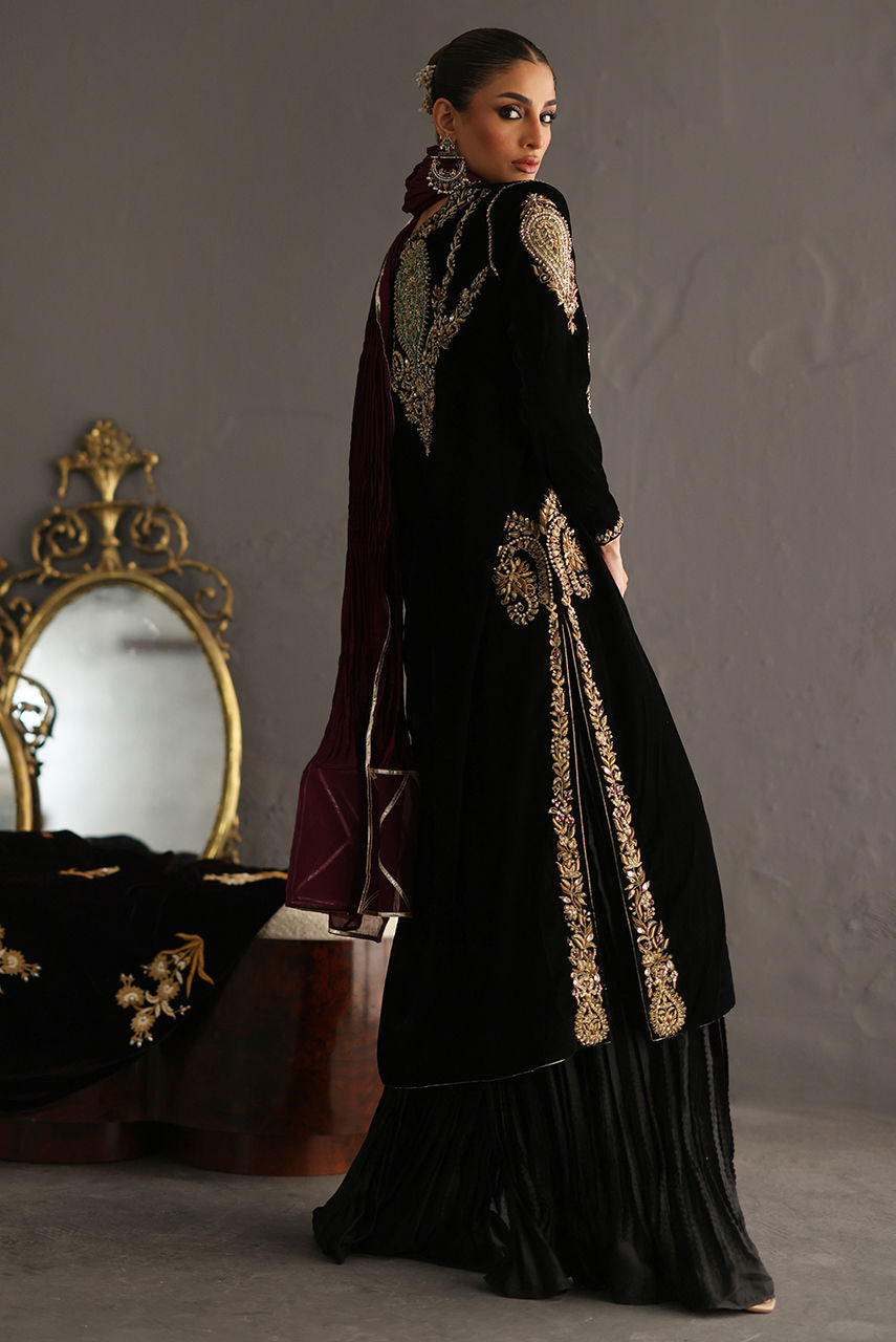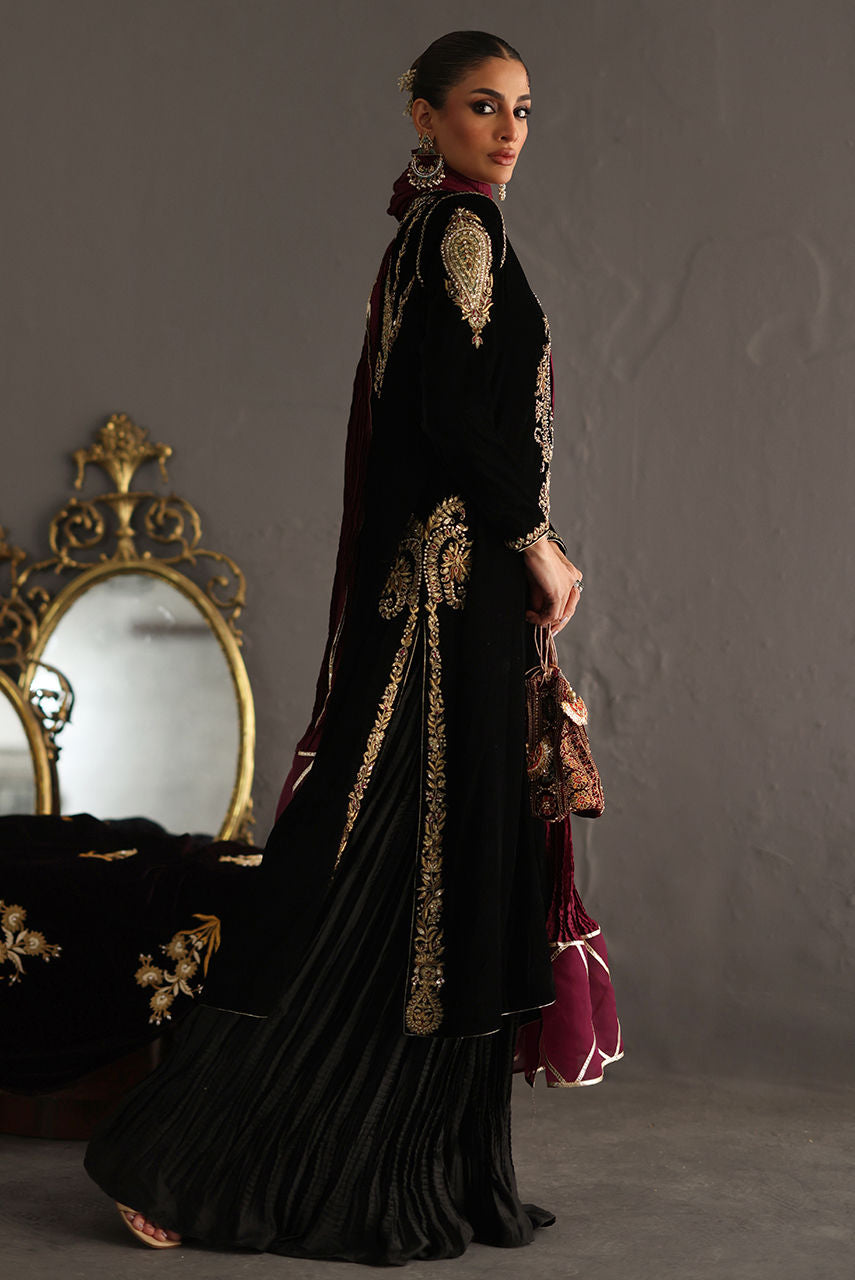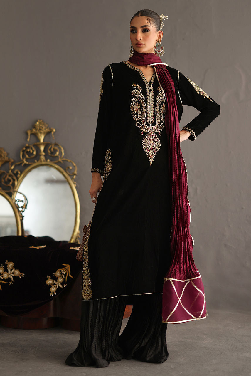 A statement black velvet long kurta adorned with intricate zardozi detailing on the back, neckline, and slits, highlighted with magenta and emerald accents. Paired with black crushed pants and a berry purple-toned crushed dupatta edged with a delicate gotta border for a regal finish.