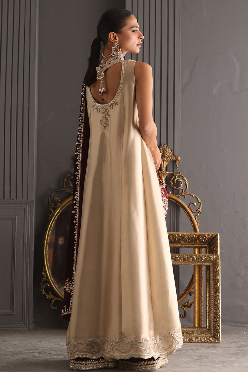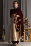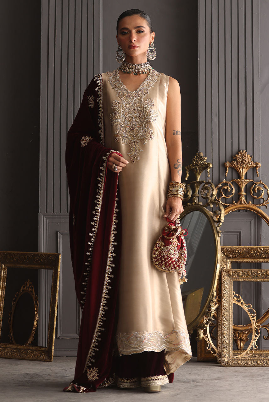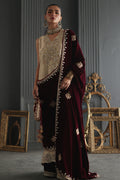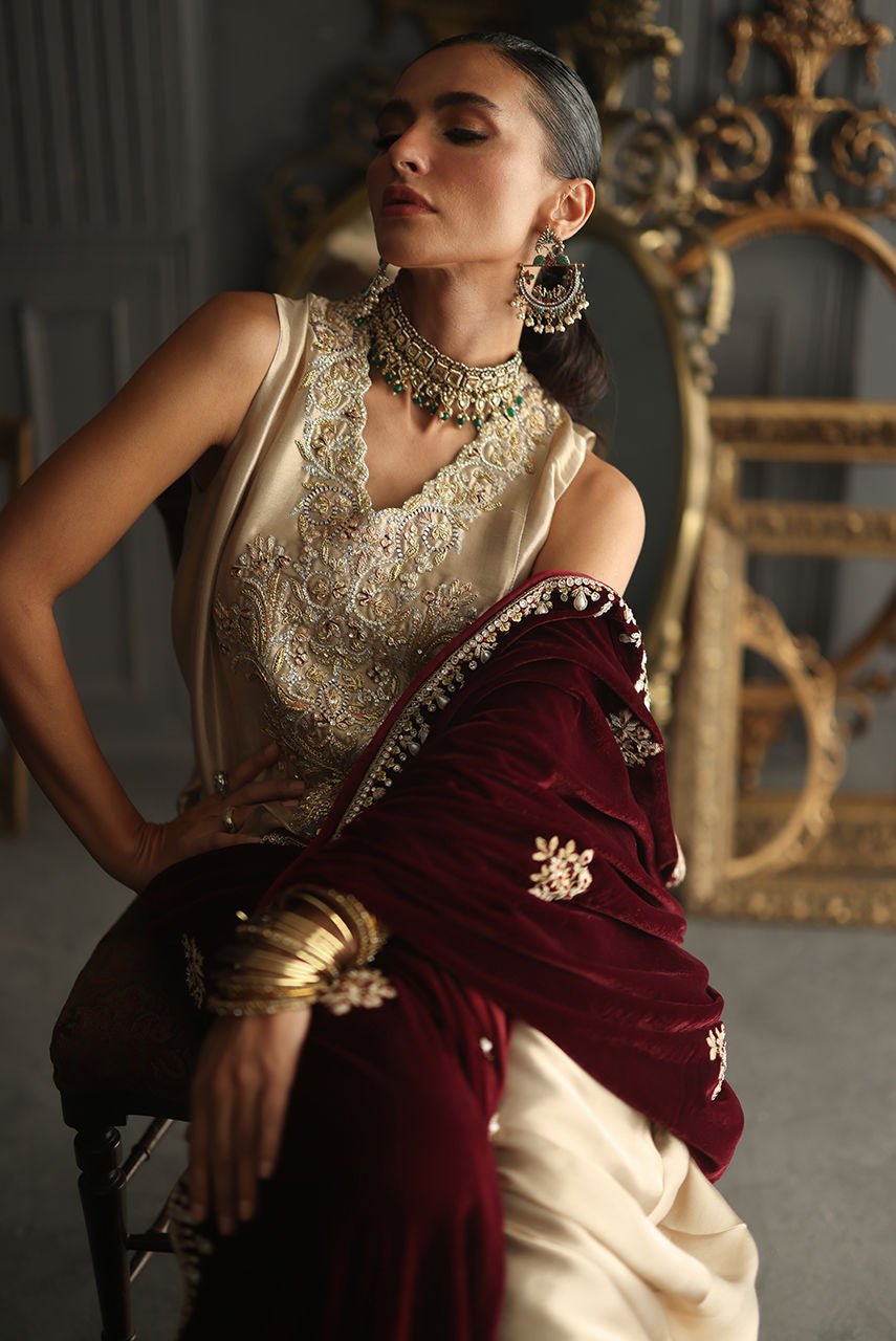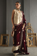 mbrace the festive season with this beautiful long Zari gold shirt featuring baroque hand worked embroidery in zardozi, resham, crystal and french knot. It is paired with a velvet palazzo featuring intricate hand work in zardozi and crystals. This hand embroidered velvet shawl embodies the poetry of luxury and craftsmanship handworked in delicate zardozi, resham and crystals.
