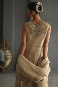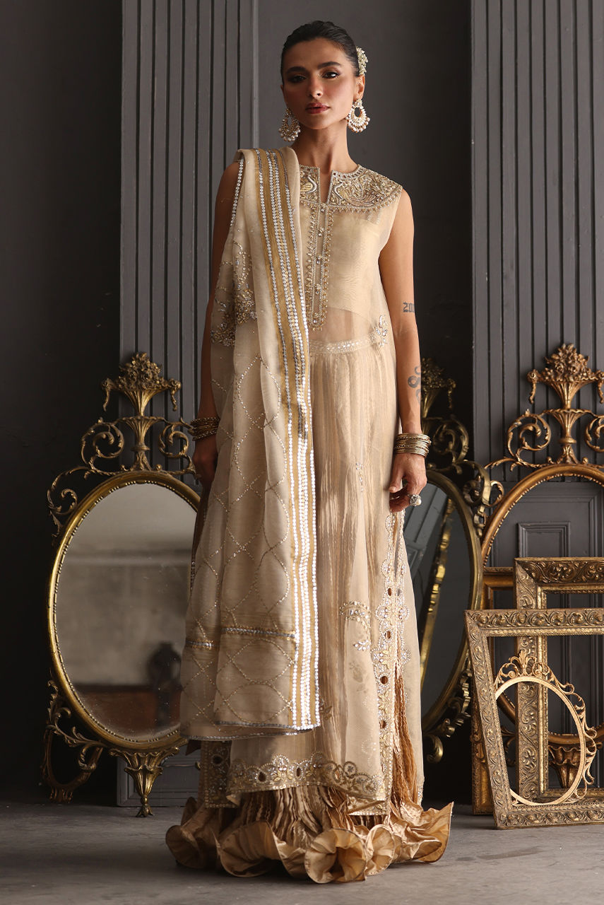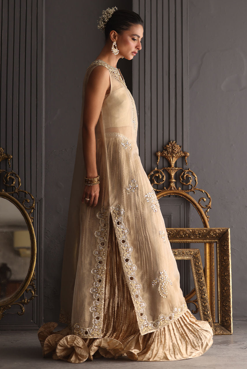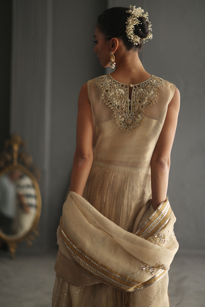 A champagne gold vision in tissue, this sleeveless column shirt embodies quiet grandeur in every detail. The lustrous surface shimmers with detailed cutwork in meticulous zardozi, resham and crystals, the embroidery frames the neckline, back and borders. Paired with a crushed bottom wired in elegant swirls. The heavy maisori dupatta features delicate repeat and jewel motifs handworked in zardozi. Sequin and crystals.