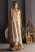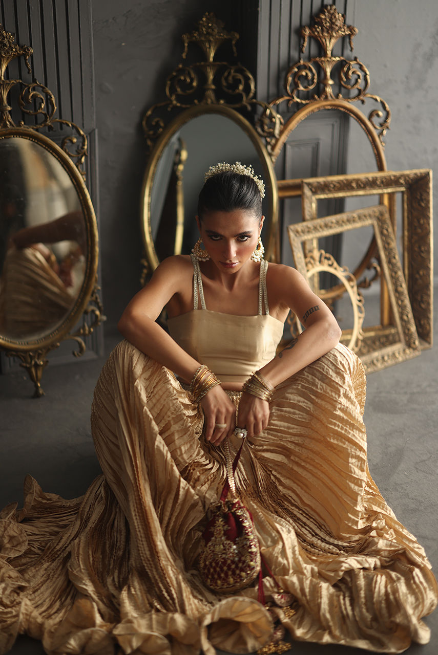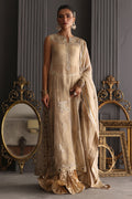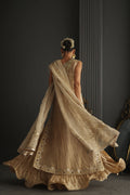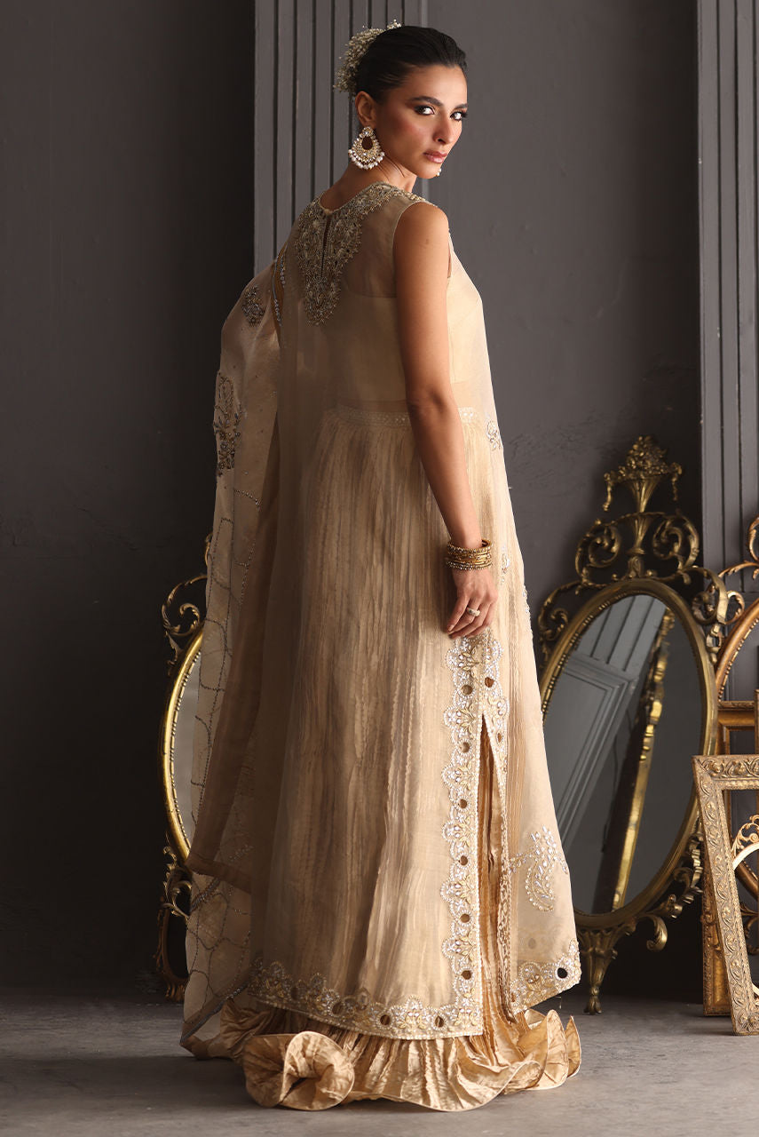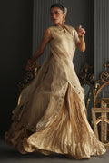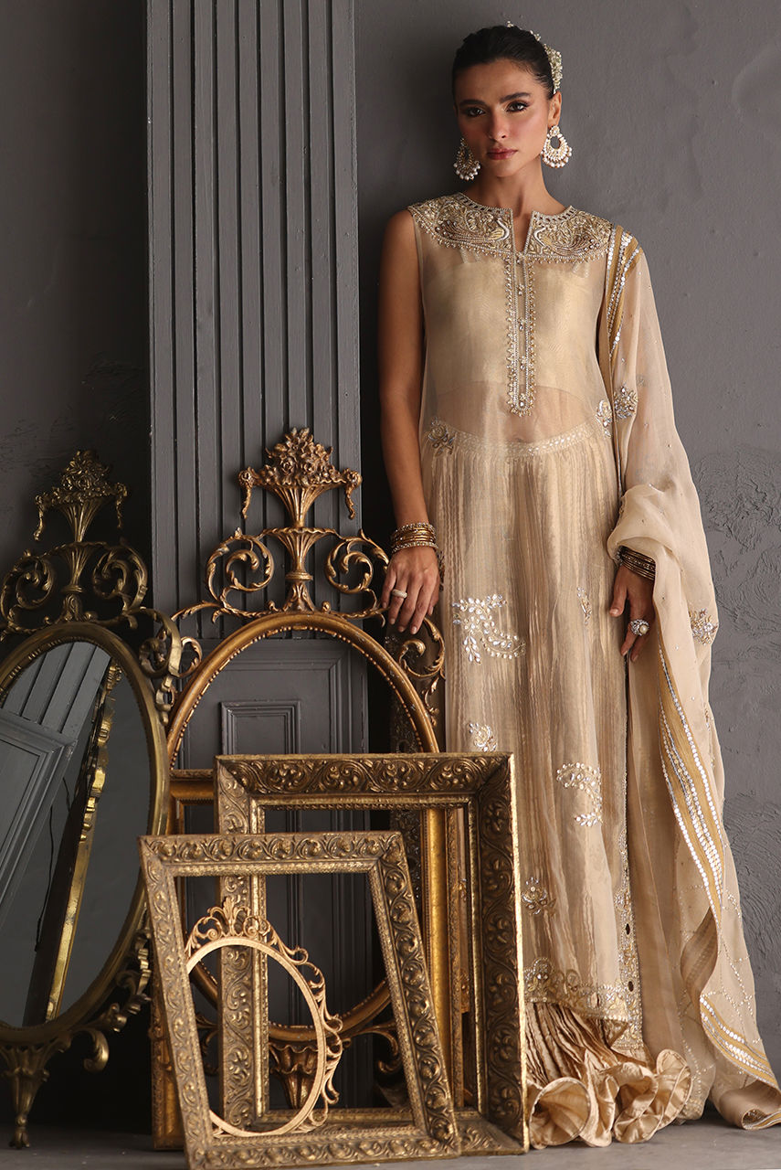 A champagne gold vision in tissue, this sleeveless column shirt embodies quiet grandeur in every detail. The lustrous surface shimmers with detailed cutwork in meticulous zardozi, resham and crystals, the embroidery frames the neckline, back and borders. Paired with a crushed bottom wired in elegant swirls. The heavy maisori dupatta features delicate repeat and jewel motifs handworked in zardozi. Sequin and crystals.