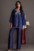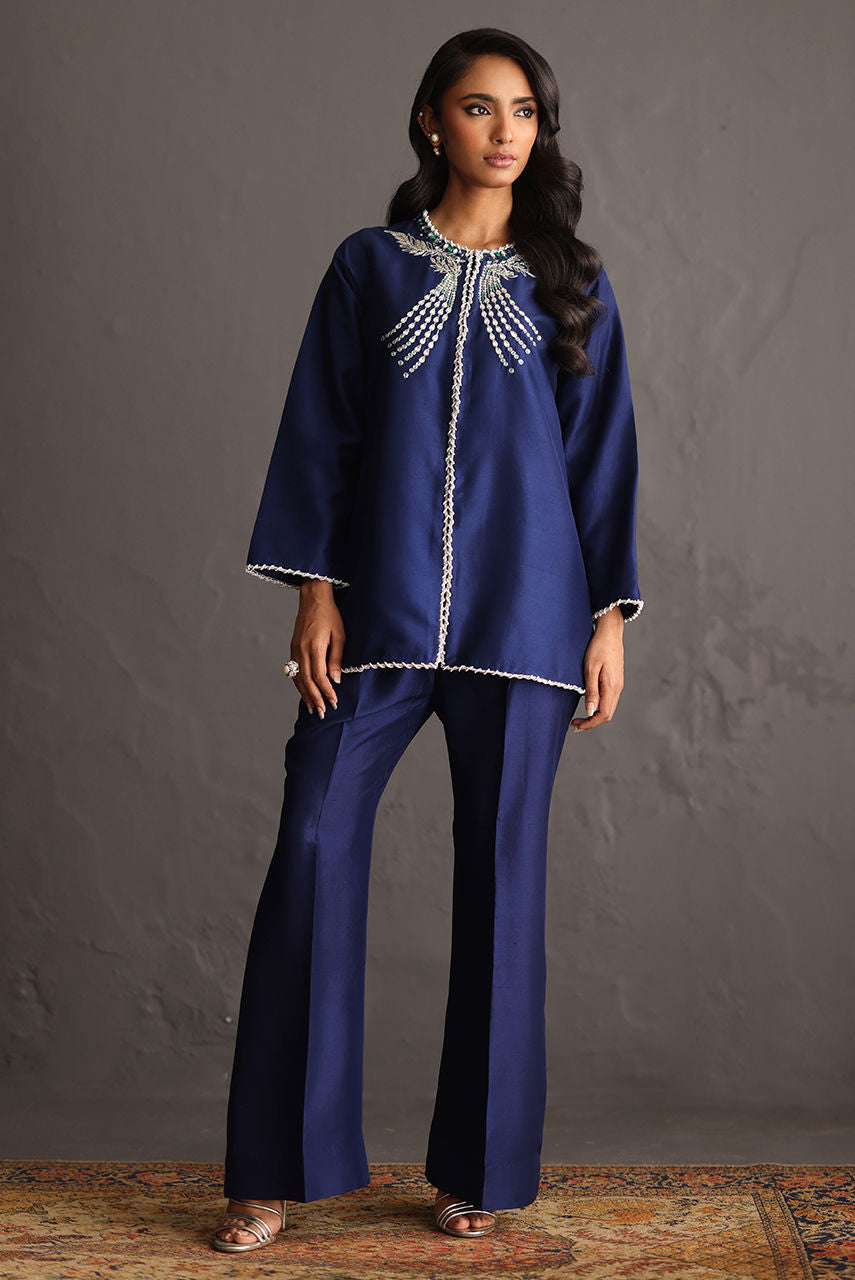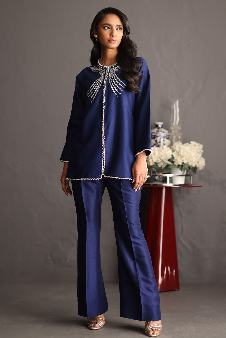 This design exudes sophistication and opulence, making it ideal for evening wear or high-end formal occasions. This elegant jacket is a statement piece of couture craftsmanship, richly adorned with hand embroidery inspired by precious jewels in crystal and pearls. The jacket and pants are crafted from pure raw silk.