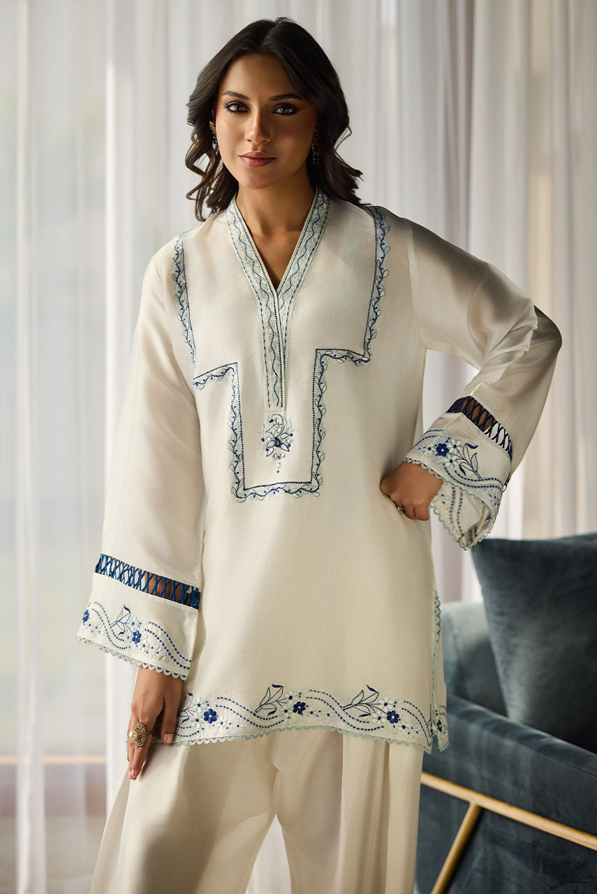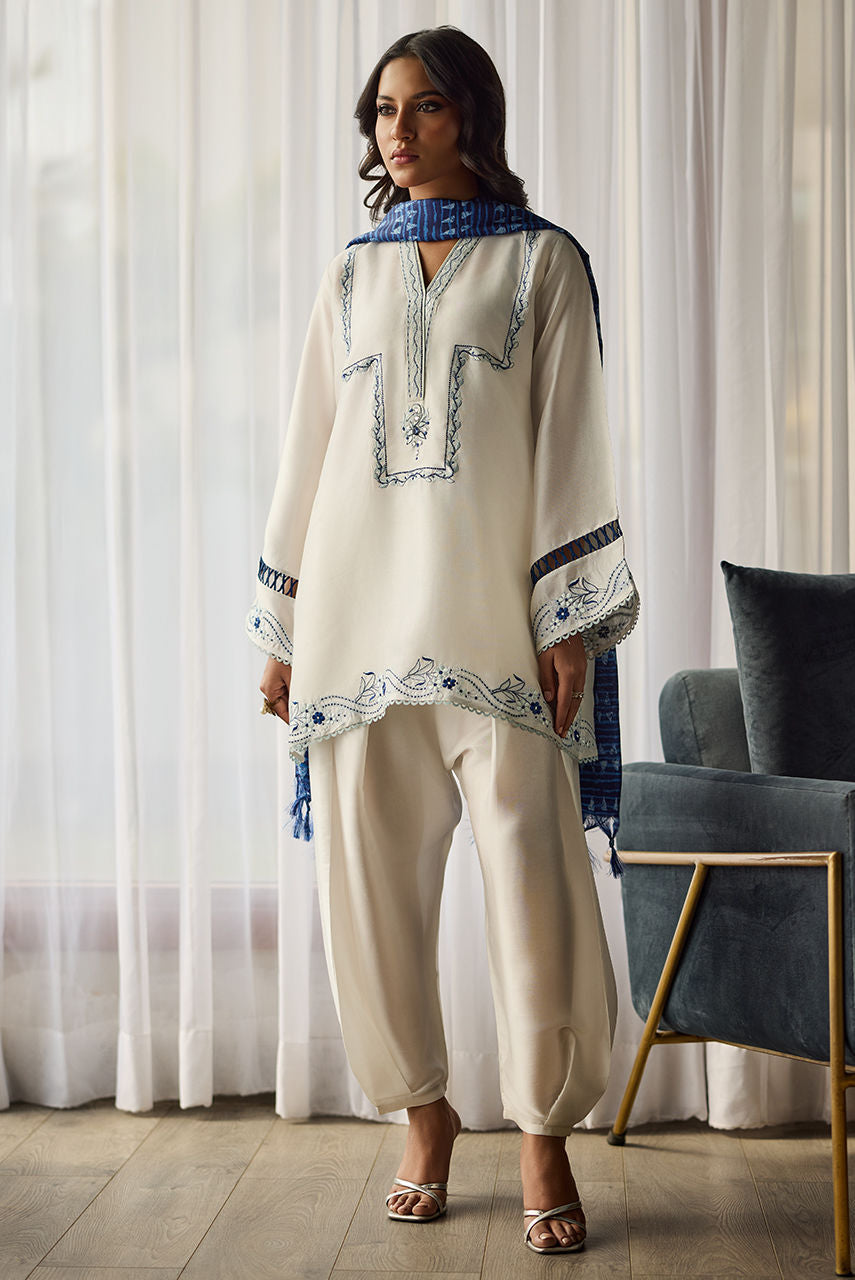 A beautifully crafted embroidered piece in soothing shades of blue and crisp white, featuring intricate motifs and delicate threadwork. The contrasting colors bring out the design’s fine details, creating a fresh, elegant, and visually striking effect. The motif on the neckline is handworked in stones and crystals. The shirt is paired with our pleated barrel shalwar. To make the look complete this printed batik inspired dupatta can be added