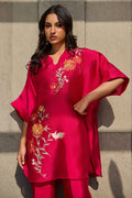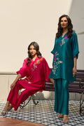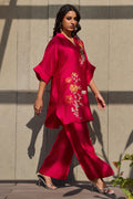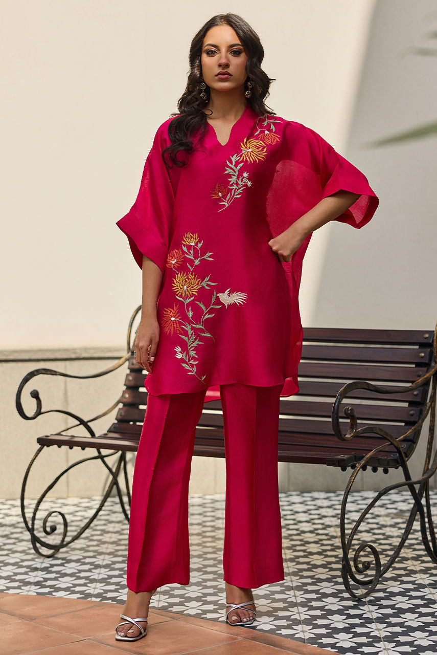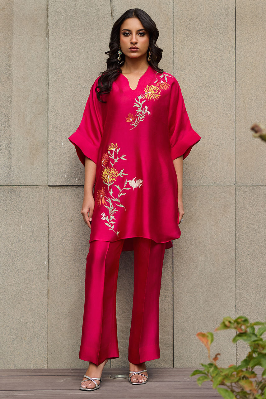 A batwing shirt with bootcut pants featuring A finely detailed thread-embroidered happy motif inspired by the delicate beauty of plum blossoms. The design blends symbolic floral elements with clean, balanced embroidery, creating a graceful and contemporary interpretation. This piece makes a perfect pret wear with a modern fusion silhouette