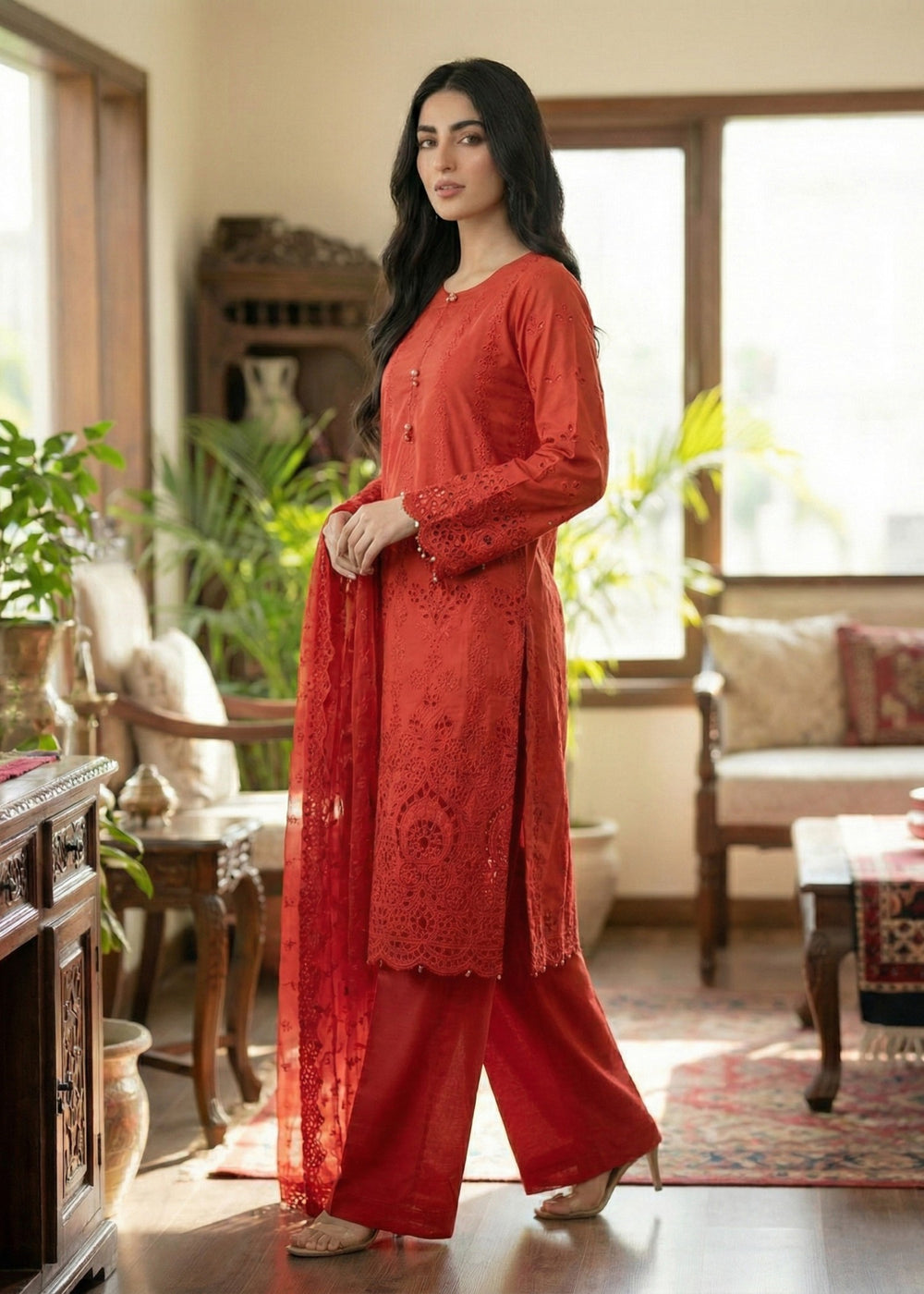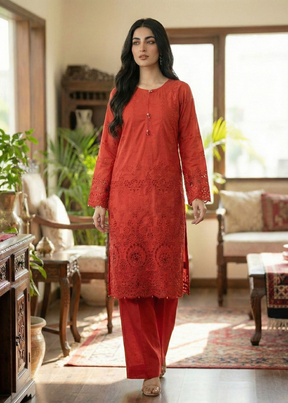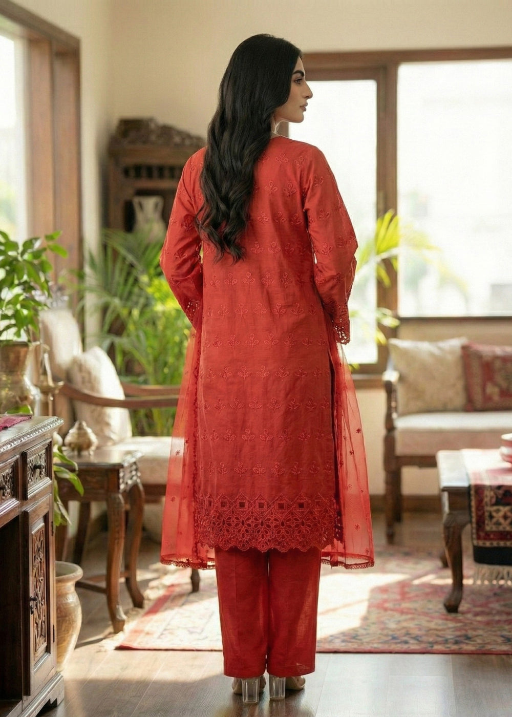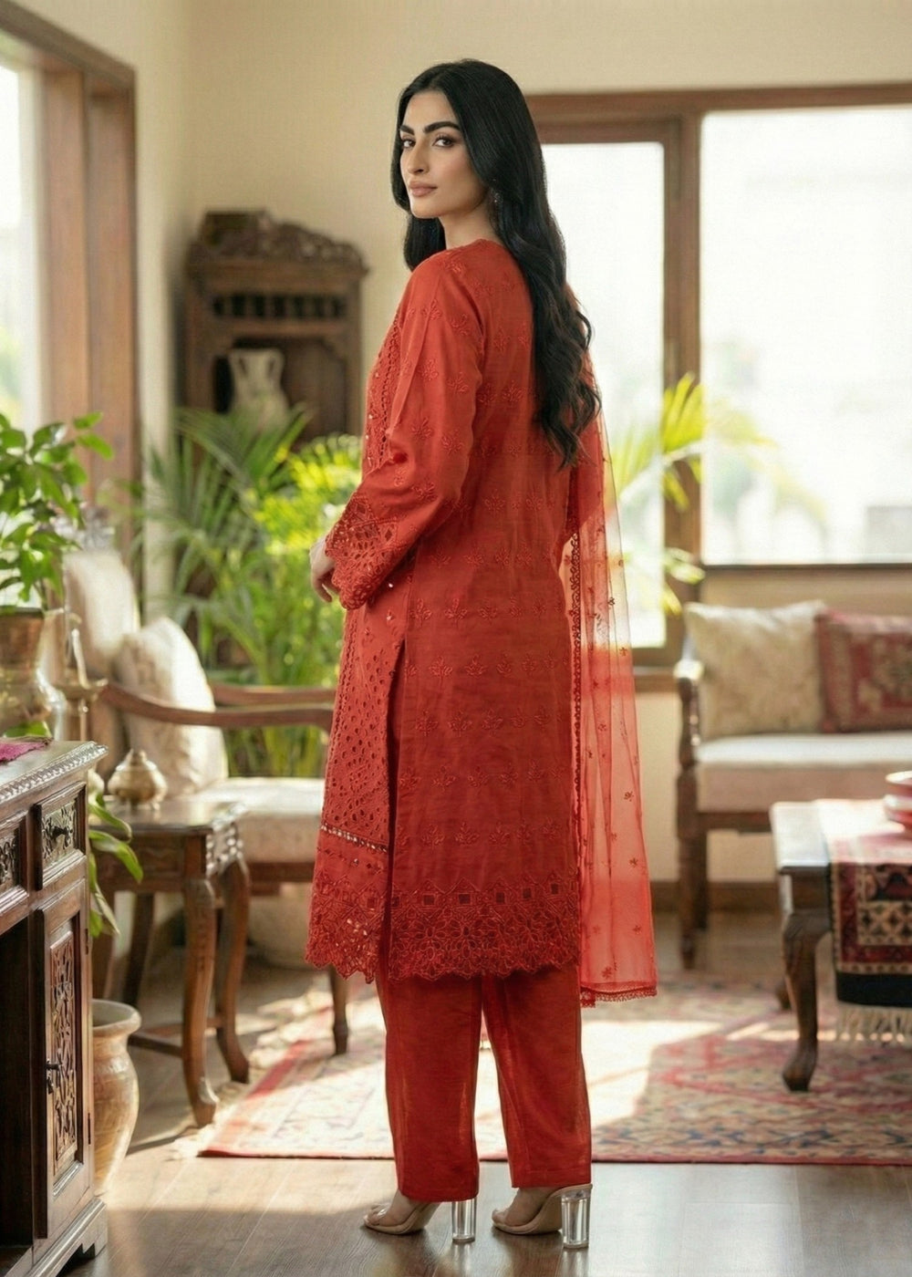 We at Khanum Jan are pleased to offer our customers a premium sewing service that prioritizes impeccable sewing styles and exceptional quality. Our team meticulously plans and sews dresses according to the brand shoots displayed on our website. However, it is important to note that brands often showcase certain design elements for illustrative purposes only, which may not be included in our dresses. Consequently, customers should anticipate minimal variations.