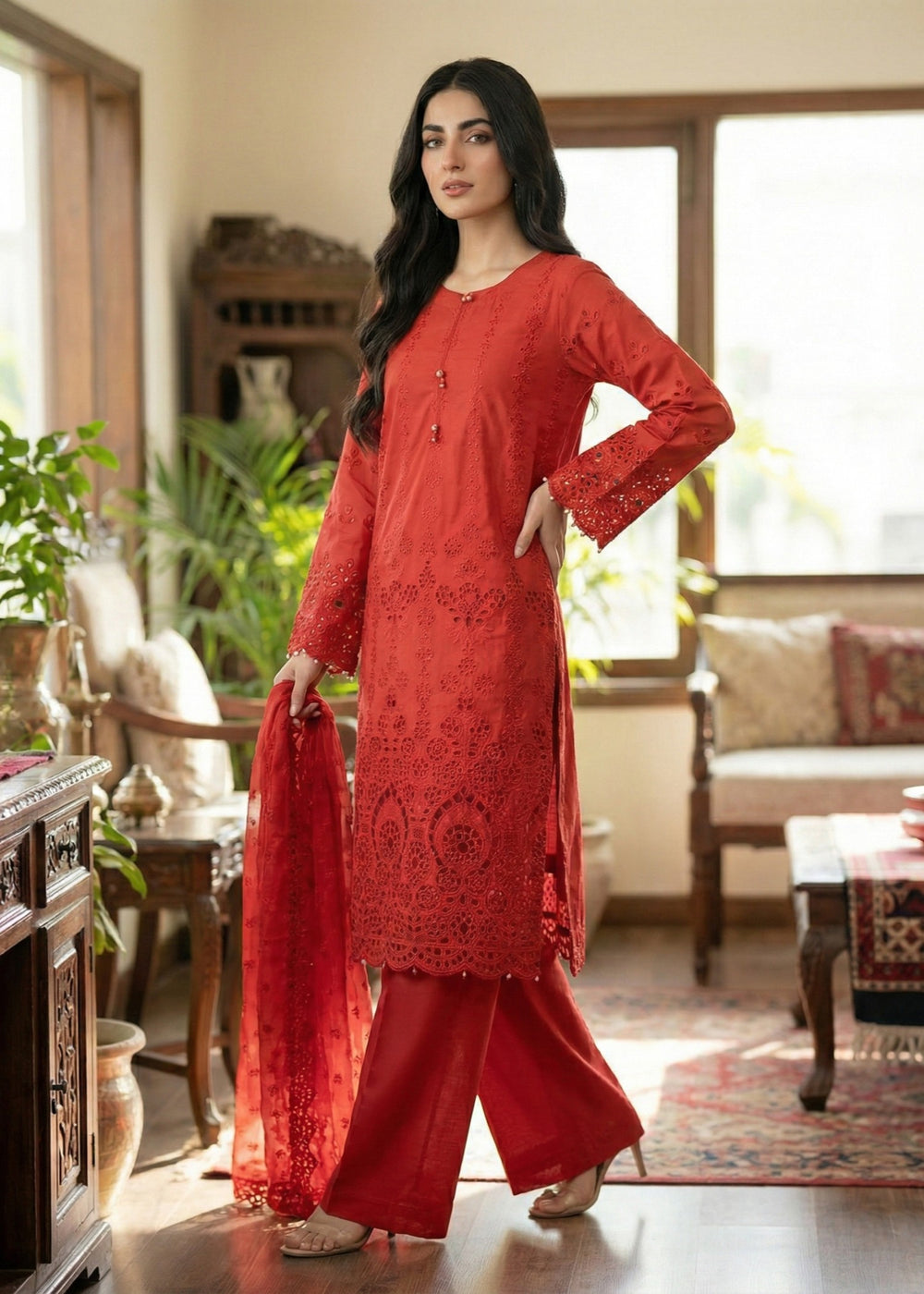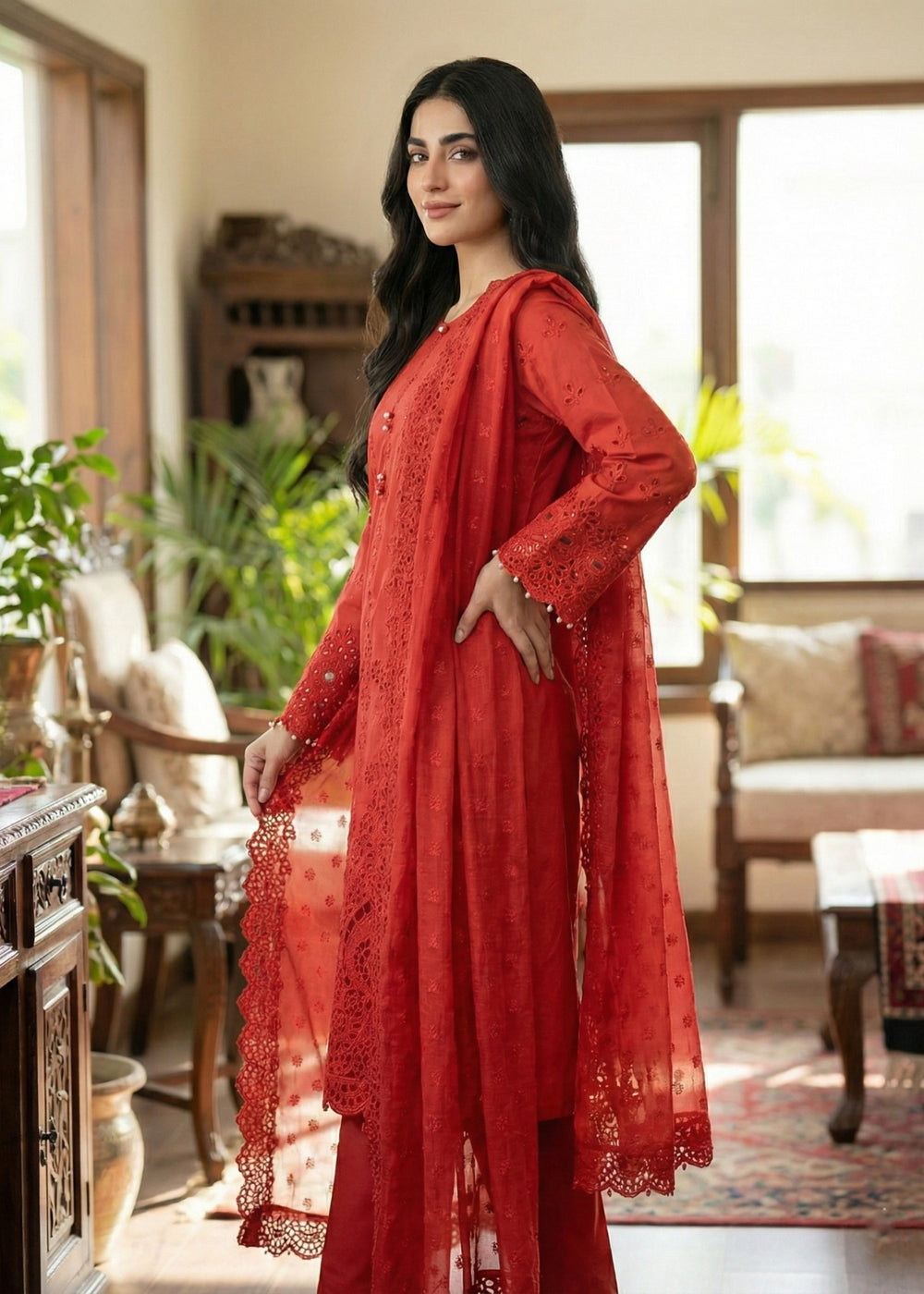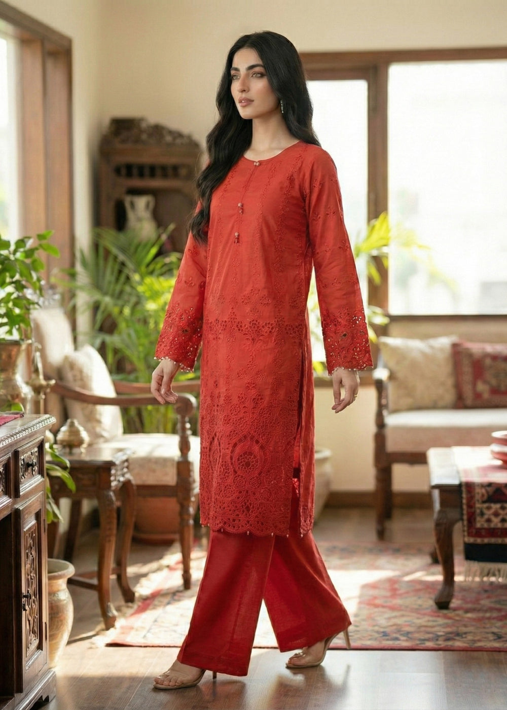 Given our Pakistani cultural background, we understand the significance of modesty. Therefore, we may make adjustments to certain design elements for modesty reasons. Examples of modifications include transforming low backs into traditionally styled regular backs, replacing drop shoulders with normal shoulders, concealing exposed stomachs, and attaching sleeves to sleeveless dresses.