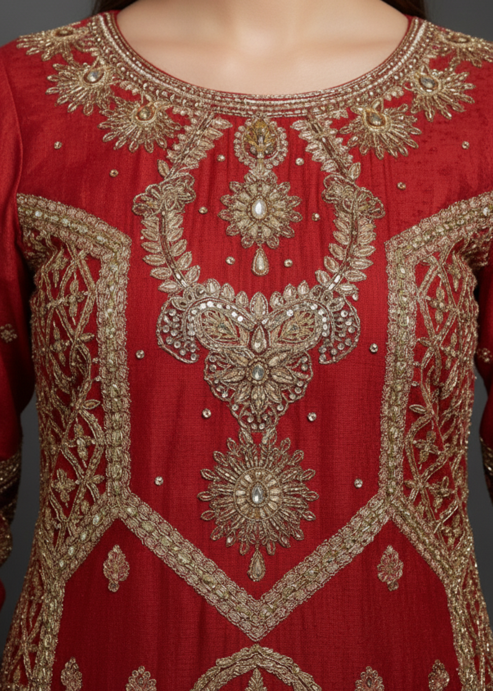 Given our Pakistani cultural background, we understand the significance of modesty. Therefore, we may make adjustments to certain design elements for modesty reasons. Examples of modifications include transforming low backs into traditionally styled regular backs, replacing drop shoulders with normal shoulders, concealing exposed stomachs, and attaching sleeves to sleeveless dresses.