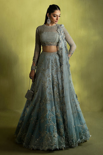 Enigmatic and enchanting, Élan’s luxury prêt-à-porter captivates with its ethereal romance and celestial elegance. The Cristal d’Aube ensemble in an exquisite shade of ice blue radiates sophistication, crafted from sumptuous fabrics in delicate, airy hues. Adorned with intricate hand embellishments, radiant pearls, and dazzling Swarovski crystals, each detail is a testament to refined artistry. Quintessential Élan tassel accents complete this breathtaking creation, making it an ideal choice for upcoming wedding festivities where elegance and opulence are paramount.