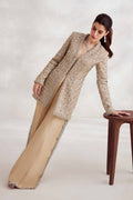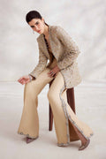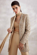 Experience the pinnacle of opulence with "Aurélien." Enveloped in a delicate champagne hue, this ensemble epitomizes refined elegance. The jacket, crafted from the finest ethereal fabric, is lavishly adorned with intricate gold crystals, Swarovski embellishments and artfully placed floral motifs, transforming it into a timeless masterpiece. Complemented by impeccably tailored bootcut pants with bejeweled side slits, this creation is a testament to understated grandeur.Elevate your look with a neck scarf adorned with exquisite tassels, radiating an aura of sophistication and leaving an indelible mark of pure luxury.