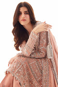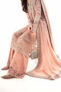 The ensemble is further elevated by a meticulously tailored trouser, featuring an exquisitely embellished applique border, and an impeccably draped chiffon dupatta, adorned with a lavishly intricate border. Designed for the most discerning clientele, “Roséa” epitomizes sophistication and sophistication, ensuring that you make an unforgettable impression at your most exclusive wedding celebrations.