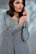 An elegant black ensemble featuring a shirt with a heavily embellished neckline adorned in a luxurious mix of kora, dabka, cutstones, and Swarovski stones in silver and gold tones. The sleeves are enhanced with embellished borders and delicate spray details. Paired with a graceful flared pant, the look is completed with a dupatta styled with double borders, finished in shamooz fabric and accented with a refined boti spray for a bold yet sophisticated statement