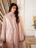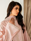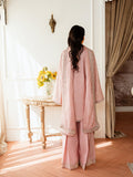 Aura — a delicate light pink Korean silk semi-formal ensemble, featuring a short shirt with a refined slit at the hem, meticulously adorned with intricate thread work, cut dana accents, lustrous pearls, and traditional baitki motifs. The design is paired with elegantly front-pleated pants, detailed with subtle hem embroidery, and complemented by a finely embroidered tissue silk dupatta. Rendered in a sophisticated setting, Aura exemplifies couture-level craftsmanship, graceful elegance