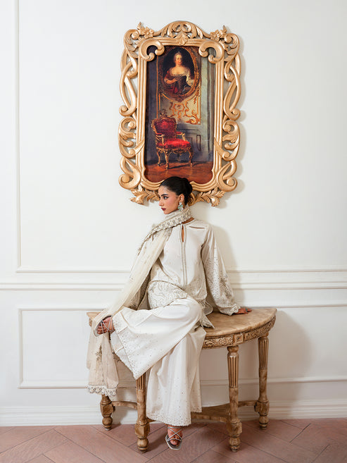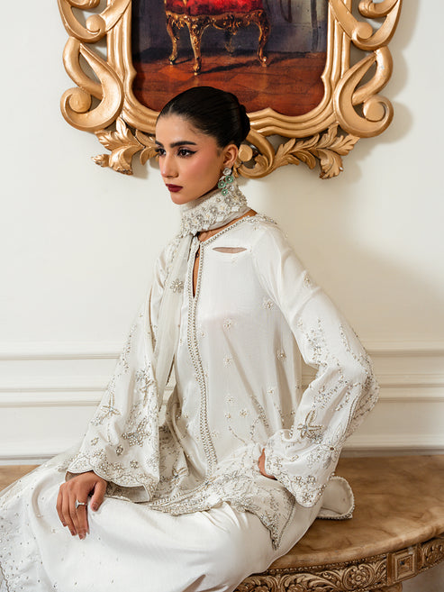 Mira” — a white Korean silk semi-formal ensemble, featuring a shirt open at the hem, exquisitely adorned with intricate thread work, tilla, lustrous pearls, crystals, pipes, crystal mirror embellishments, and delicate lace detailing. The design showcases precisely defined front and back necklines and is elegantly paired with flared pants and a finely embroidered organza dupatta. Rendered in a sophisticated setting and refined semi-formal sophistication.