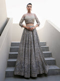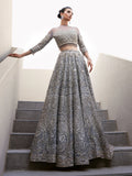 This exquisite dress is a masterpiece, featuring intricate white pearls, Naskhi, Cora, and dabka work that add depth and texture. Delicate silver sequins and champagne pearls enhance its elegance, while bathki embroidery adds timeless appeal. Silver-golden cut moti and tilla work create a mesmerizing, ethereal effect. The playful tassels at the sleeves and the voluminous cancan beneath the lehenga ensure a graceful silhouette, all crafted from luxurious tulle fabric.