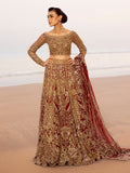 The bridal gown is a timeless masterpiece, featuring intricate golden embroidery, golden pearls, sequins, and Japanese cut golden beads for a sparkling effect. Antique details and sequin-embellished lines enhance its captivating beauty, while the wide boat neck offers a sophisticated silhouette. Accompanied by a regal veil and dupatta, the gown is completed with a cancan beneath the lehenga for added volume and structure, creating a luxurious, full-bodied look.