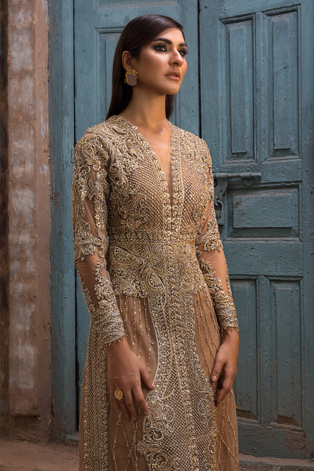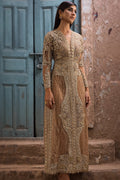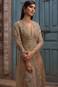 A majestic gold ensemble adorned with shaded, katori and metallic sequins. Exquisite net embroidery work embellished with swaroskis and crystals adding in to the bling of the whole attire.