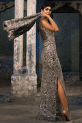 For women who want to make a stellar appearance, Stella is the perfect choice. This grey colored outfit is enlivened with a trendy neckline featuring pearls and swarovski crystals. This delightful ensemble is made to be worn by those who captivate others through their glory and charm.
