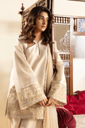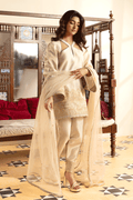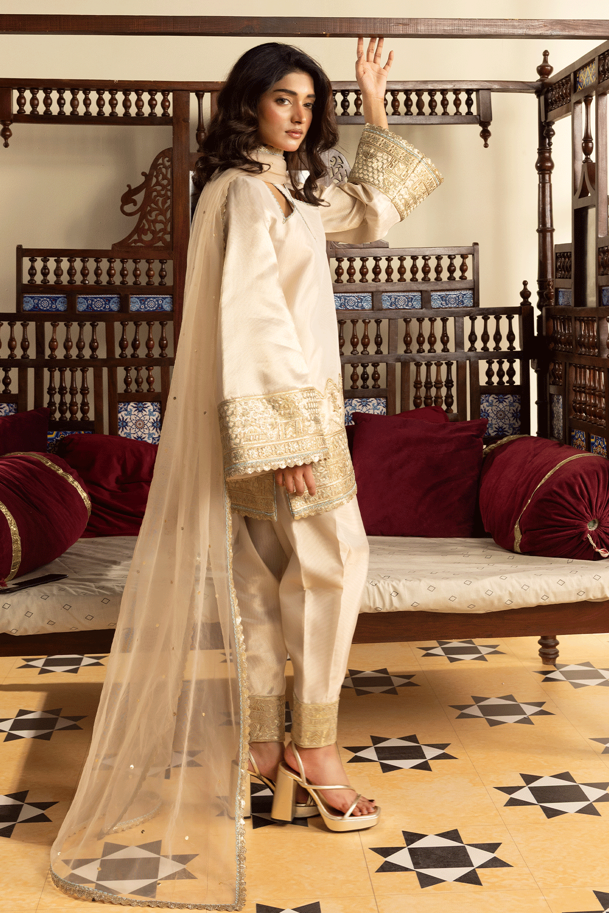 The ensemble is complemented by a delicate organza dupatta, adding airy grace and refined charm to the overall look. The harmony of texture and shine makes it perfect for Eid gatherings and evening festivities.