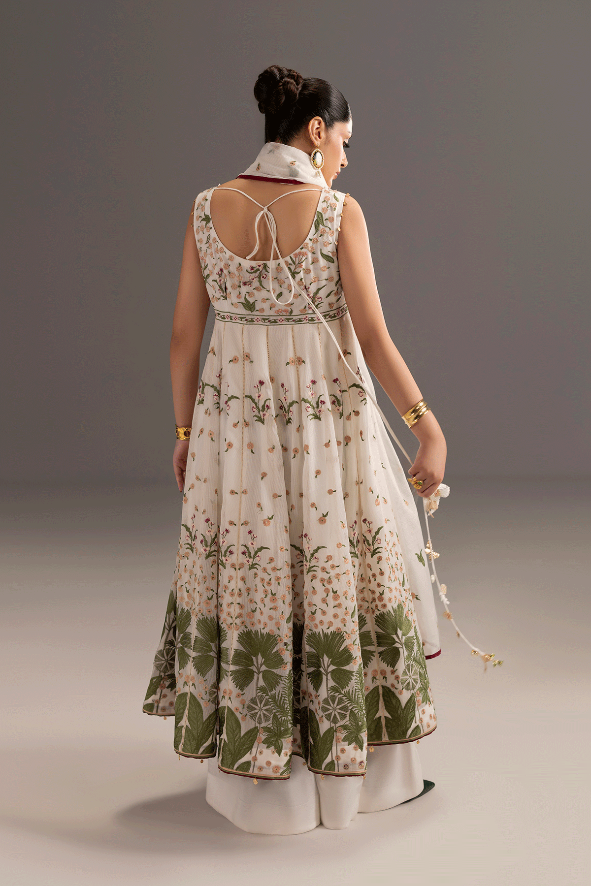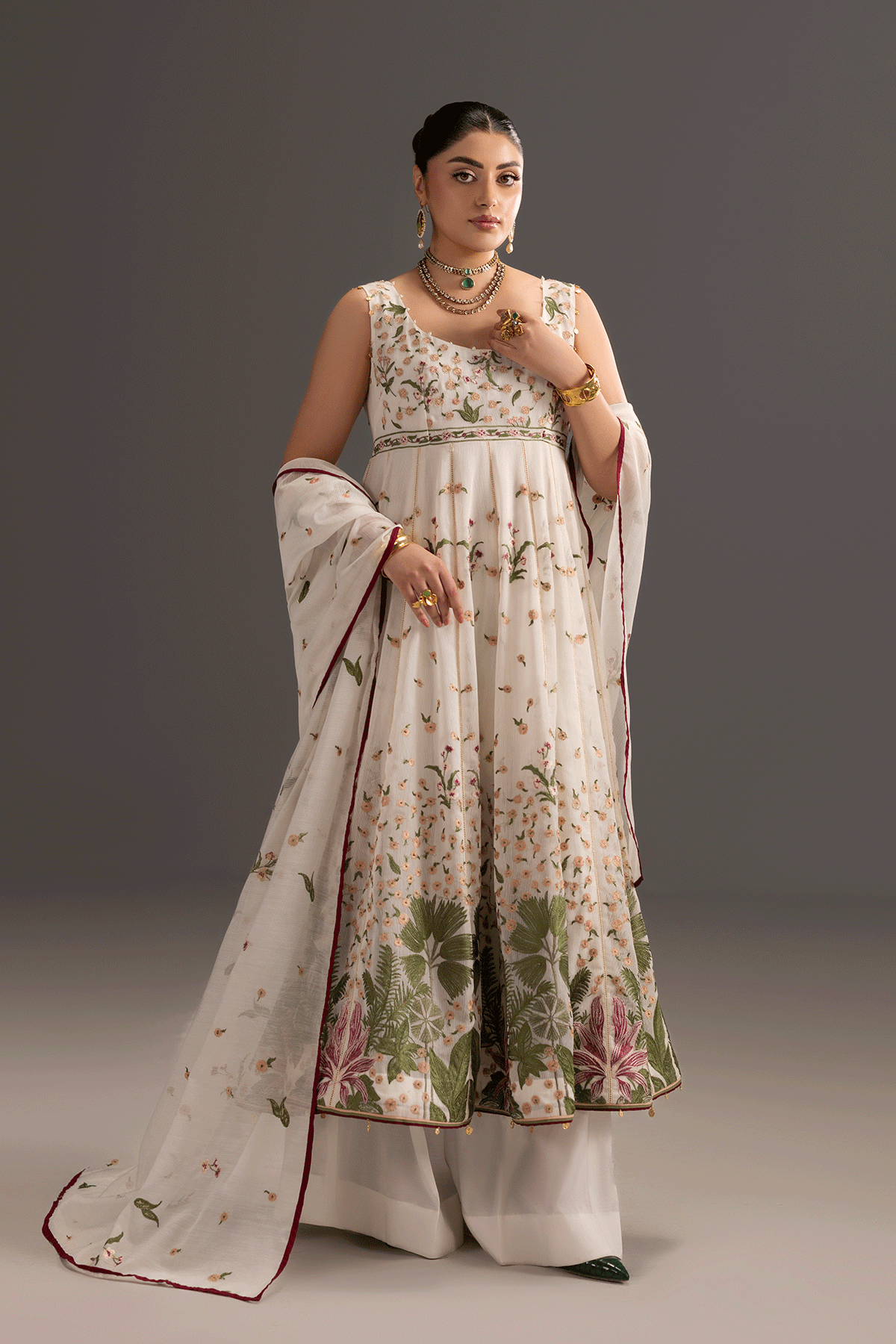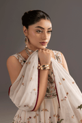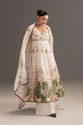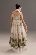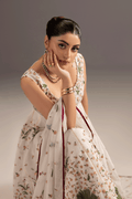 This exquisite 3-piece ensemble features a modern pishwas crafted in luxurious ivory cotton net adorned with floral embroidery. The bodice and hem are enriched with Green, maroon, shades of peach and pink embroidery beautifully create a graceful, flowing silhouette. The outfit is paired with a white trouser and a cotton net dupatta. Perfect for summer gatherings, and festive occasions, this pishwas combines elegance and comfort, making it a timeless addition to your wardrobe..