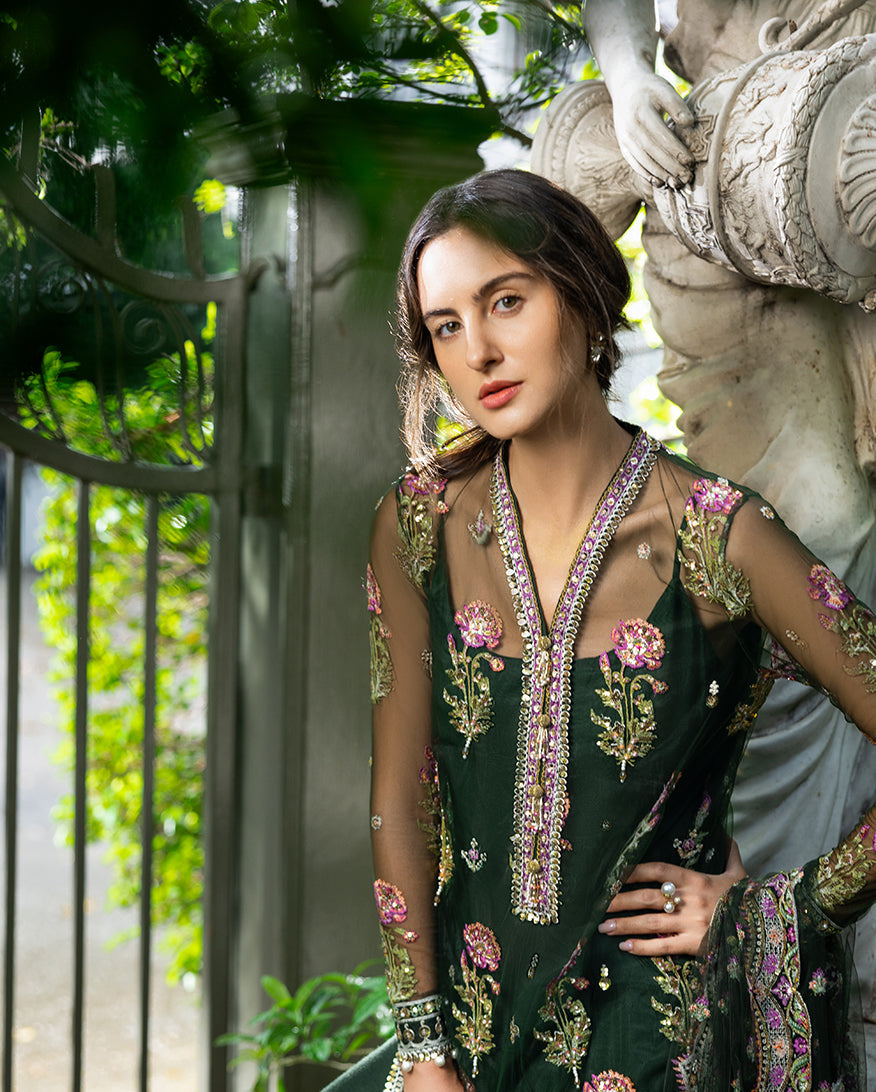 • Hand-embellished front daman border (organza)