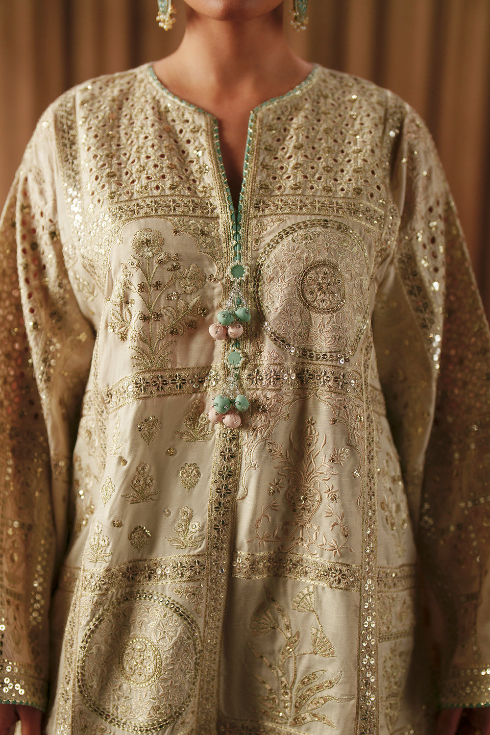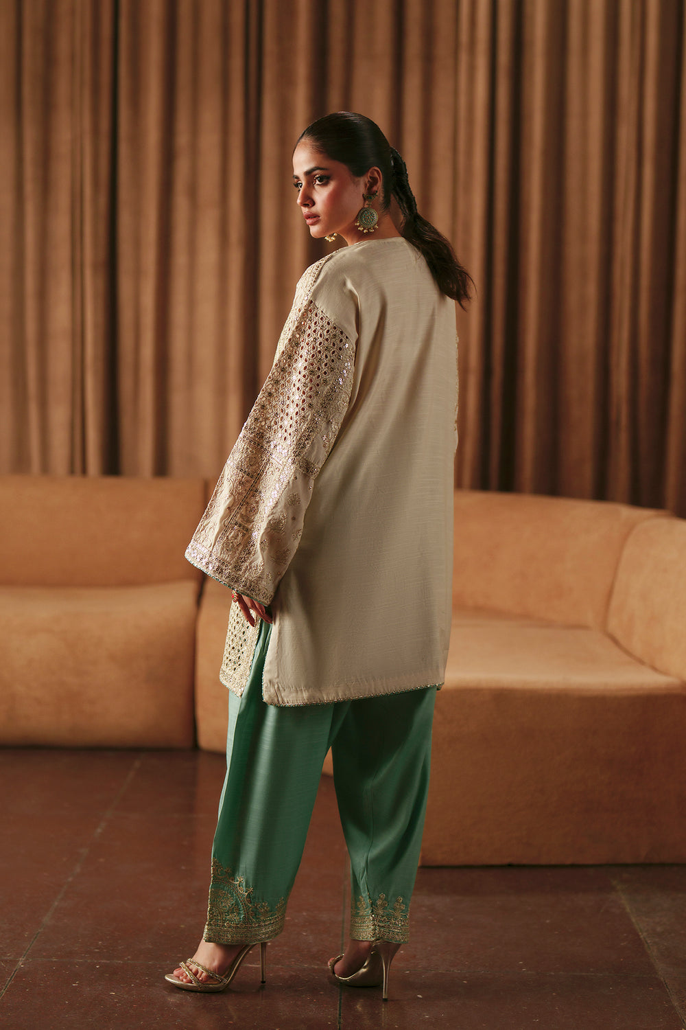 Drenched in timeless elegance, this stunning embroidered suit exudes regal sophistication. The off-white shirt provides a graceful canvas for intricate gold embroidery and subtle sequin work that embellish the entire front and the flared sleeves, further enhanced with delicate laser-cut detailing. Designed in an A-line silhouette, the shirt is paired with a contrasting straight-fit green shalwar, finished with a coordinated gold-embroidered border that ties the look together beautifully. A refined blend of classic hues and artisanal craftsmanship, this ensemble is perfect for making a graceful yet grand statement at festive and formal occasions.